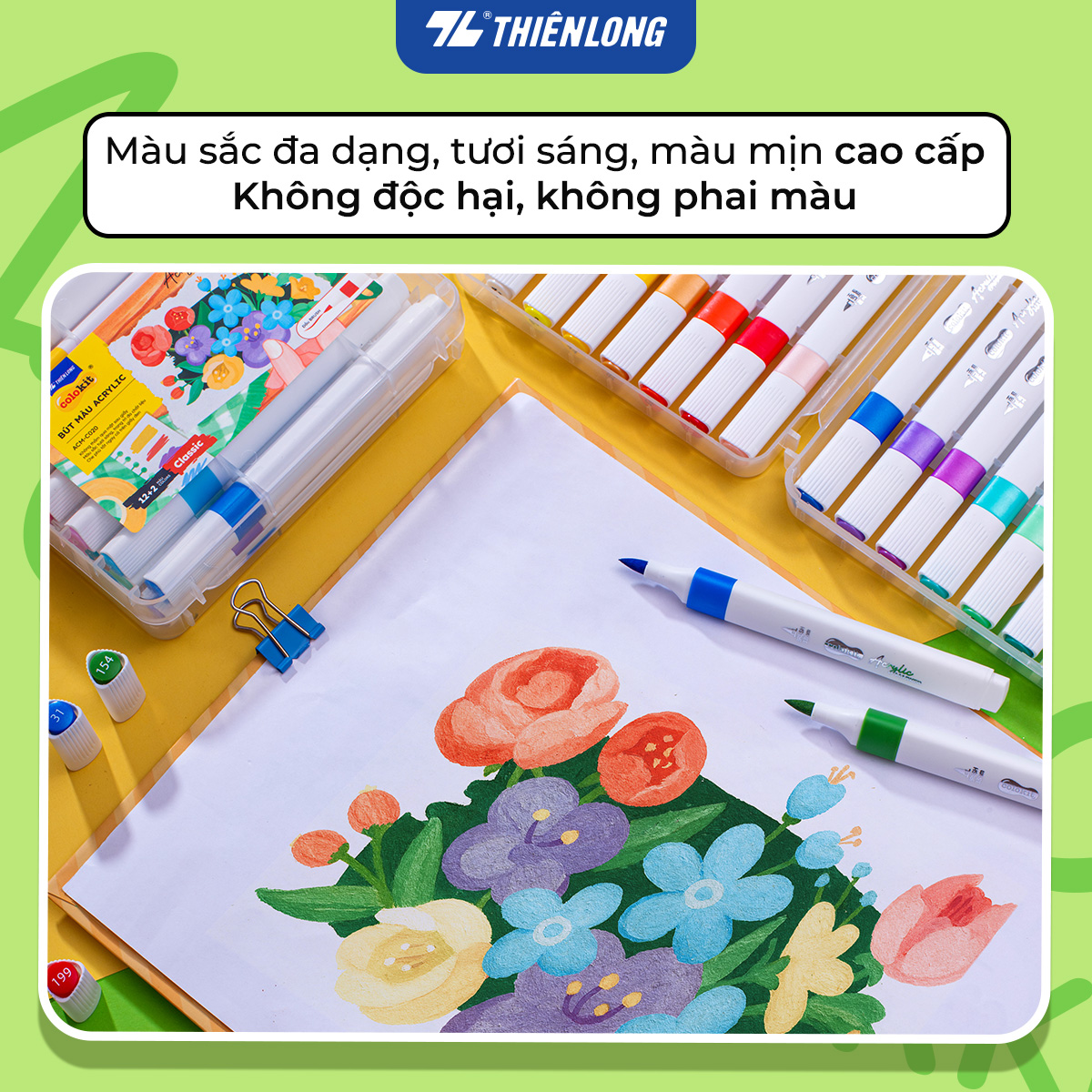 Bút lông màu Acrylic Markers Thiên Long Colokit 12/24/36 màu với thiết kế đầu BRUSH linh hoạt đáp ứng được đa dạng nhu cầu sử dụng. Bút màu Acrylic khô nhanh, chống nước tốt và sử dụng được trên nhiều chất liệu như giấy, vải, nhựa, gốm…