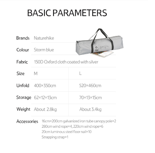 TĂNG DÃ NGOẠI PHỦ BẠC NATUREHIKE NH16T012-S/NH16T013-S THÔNG TIN SẢN PHẨM: - Thương hiệu: NatureHike - Mã sản phẩm: NH16T012-S/ NH16T013-S - Chất liệu: Oxford 150D phủ bạc - Kích thước & Trọng lượng: + Size M: Kích thước sử dụng 400cm x 350cm; Kích thước gấp gọn 621213cm; Trọng lượng 2.8kg + Size L: Kích thước sử dụng 520460cm; Kích thước gấp gọn 701315cm; Trọng lượng 3.4kg - Màu sắc: Xanh xám - Bộ gồm mái che, 02 cột chống, phụ kiện dây, cọc lều - Ưu điểm: Gọn, Nhẹ, dễ sử dụng - Phù hợp với các chuyến đi dã ngoại gia đình