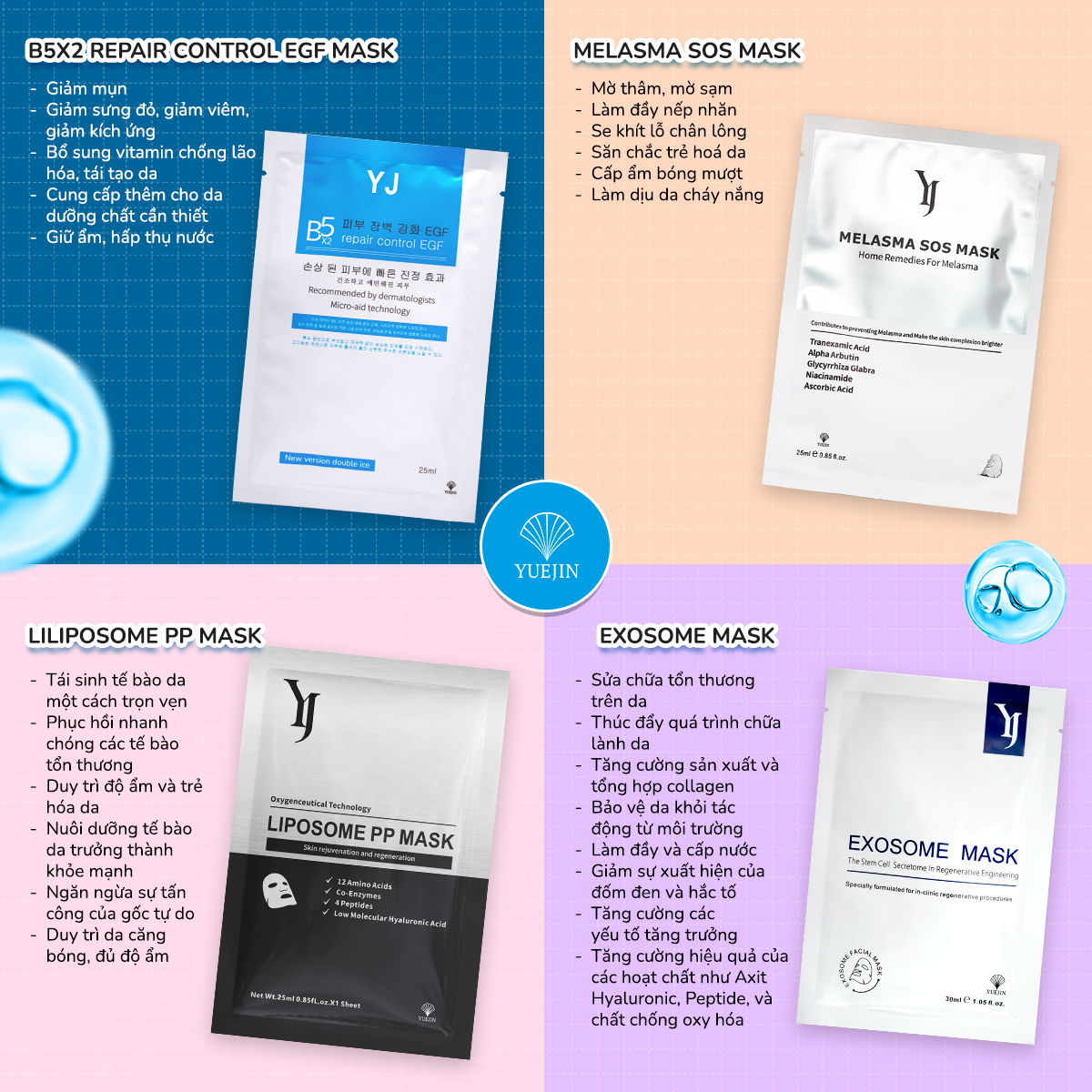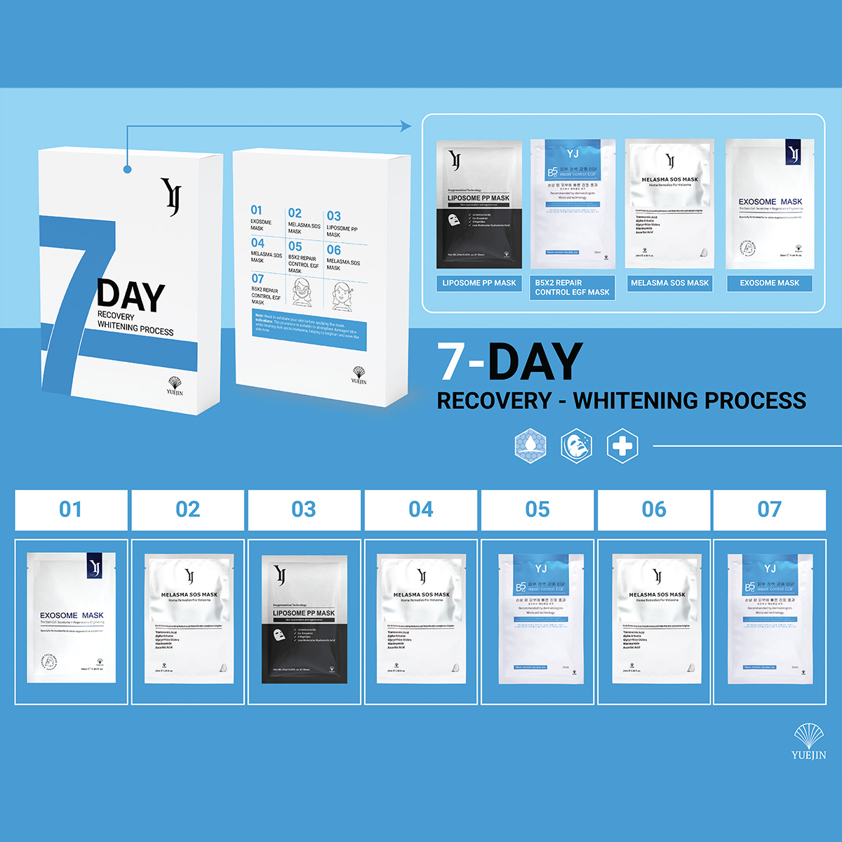 Bộ sản phẩm 7 ngày Yuejin với sự kết hợp hoàn hảo của 3 mặt nạ Melasma SOS sáng da, 2 mặt nạ phục hồi B5, 1 mặt nạ cấp ẩm Liposome và 1 mặt nạ tế bào gốc Exosome mang đến giải pháp toàn diện cho làn da, giúp phục hồi da nhanh chóng và dưỡng da trắng sáng rạng rỡ.