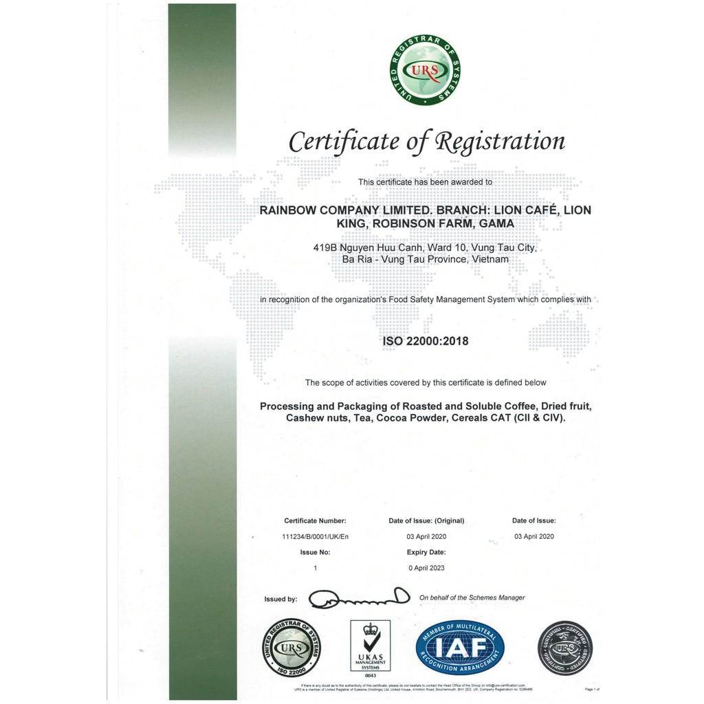 Đạt Chứng nhận quốc tế ISO 22000:2018 An Toàn Thực Phẩm cấp bởi Tổ Chức URS Anh Quốc.