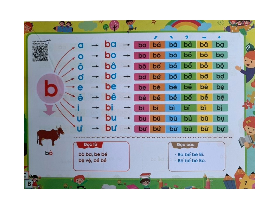 Mỗi bài học gồm các từ vựng, câu, đa dạng, bé tha hồ tập đánh vần, tập đọc mà không bị nhàm chán. Đặc biệt, các chữ in mầu, vẽ sơ đồ cầu trúc từ đơn giản đến phức tạp cực kỳ đễ hiểu và logic cùng màu sắc tươi tắn khiến cho việc học trở nên thú vị hơn.