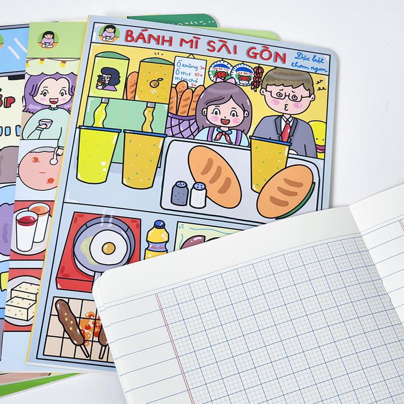 Bìa vở trang trí hình ảnh dễ thương, màu sắc nổi bật, tạo cảm hứng cho các em trong quá trình học tập.