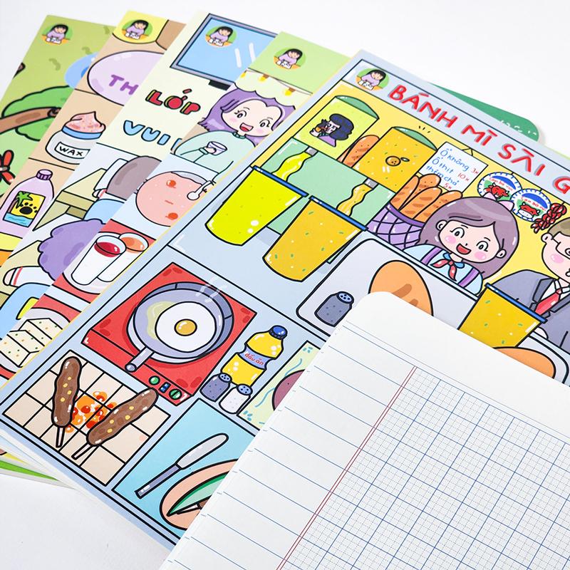 Bìa vở trang trí hình ảnh dễ thương, màu sắc nổi bật, tạo cảm hứng cho các em trong quá trình học tập.