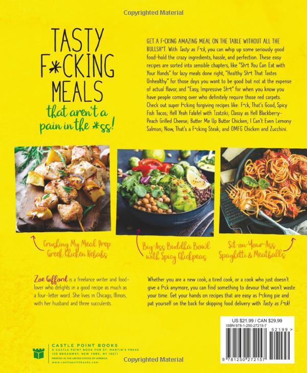 An edgy, funny, and outrageously helpful cookbook for those of us who want a side of sass with our burgers. With easy recipes for quick dinners you can make without a culinary degree and ten trips to the store, Tasty as Fck is a go-to reference for new cooks, tired cooks, and cooks who just don’t give a fck anymore.