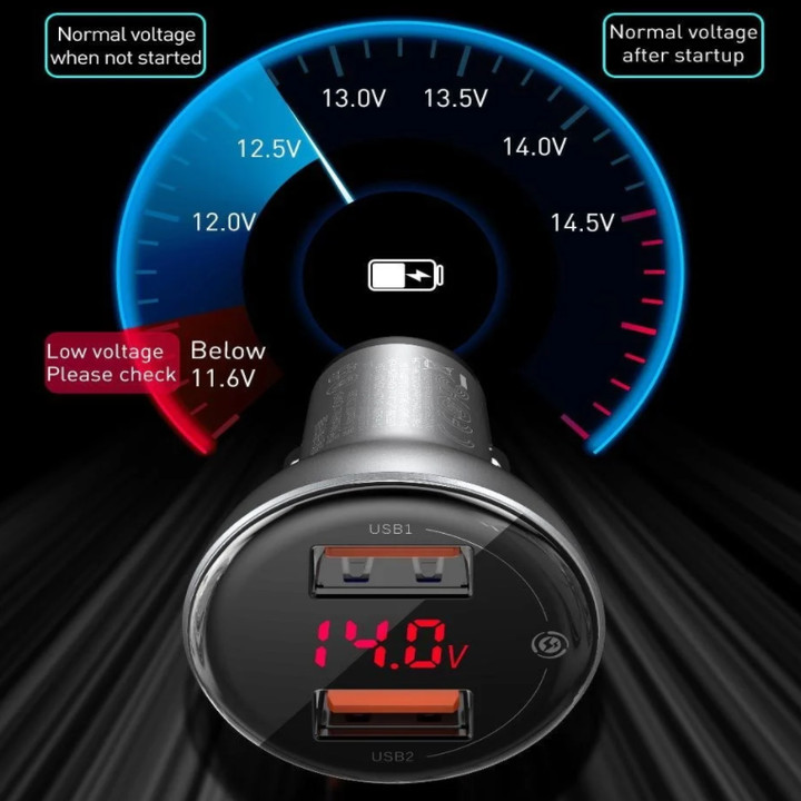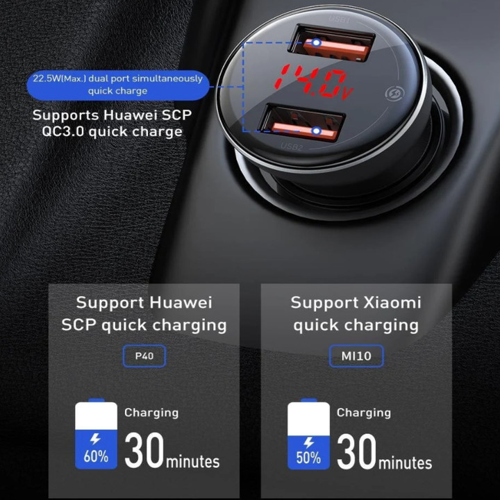 Tẩu sạc đa năng công suất cao Baseus Digital Display Dual SCP Quick Charger (45W, 2 Ports USB, LED Display, SPC/ QC4.0 Car Quick charger)