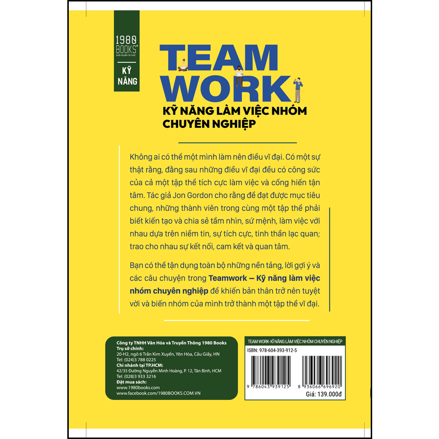 Teamwork là một trong những kỹ năng cần thiết và quan trọng nhất đối với mỗi người. Đây là kỹ năng chỉ quá trình phối hợp, tương tác và cộng tác giữa hai hoặc nhiều người trong cùng một tổ chức. Bằng cách phân chia công việc chung thành những phần việc nhỏ, mỗi người sẽ đảm nhận một nhiệm vụ đúng với chuyên môn, thế mạnh của bản thân và đảm bảo cùng thực hiện một mục tiêu chung, cùng hoàn thành công việc nhanh chóng, hiệu quả. “Muốn đi nhanh hãy đi một mình, muốn đi xa hãy đi cùng nhau”. Không ai có thể một mình làm nên điều vĩ đại. Có một sự thật rằng, đằng sau những điều vĩ đại đều có công sức của cả một tập thể tích cực làm việc và cống hiến tận tâm. Tác giả Jon Gordon cho rằng để đạt được mục tiêu chung, những thành viên trong cùng một tập thể phải biết kiến tạo và chia sẻ tầm nhìn, sứ mệnh, làm việc với nhau dựa trên niềm tin, sự tích cực, tinh thần lạc quan; trao cho nhau sự kết nối, cam kết và quan tâm. Bạn có thể tận dụng toàn bộ những nền tảng, lời gợi ý và các câu chuyện trong cuốn sách Teamwork – Kỹ năng làm việc nhóm chuyên nghiệp để khiến bản thân trở nên tuyệt vời và biến nhóm của mình trở thành một tập thể vĩ đại. Cuốn sách trợ giúp chúng ta: