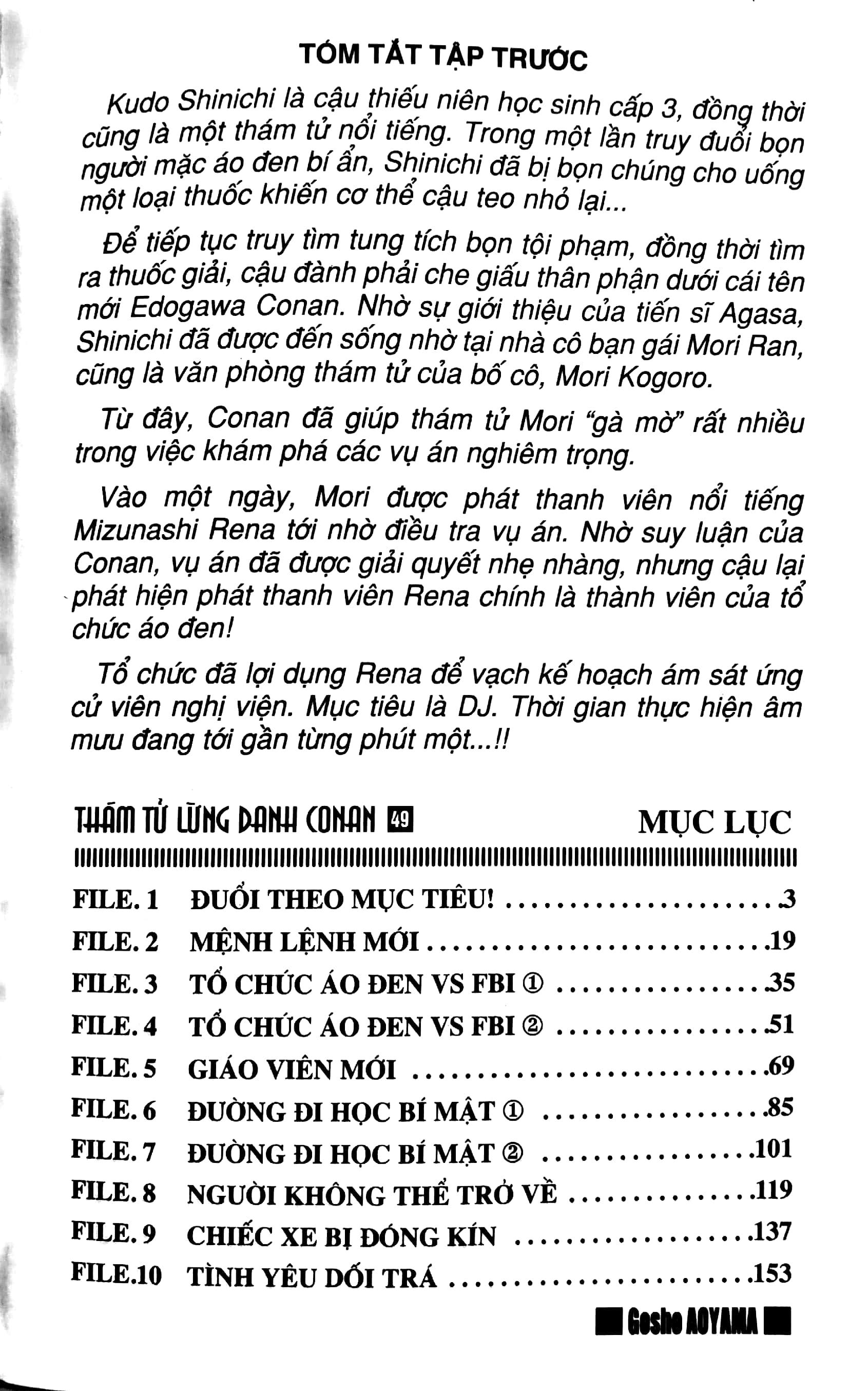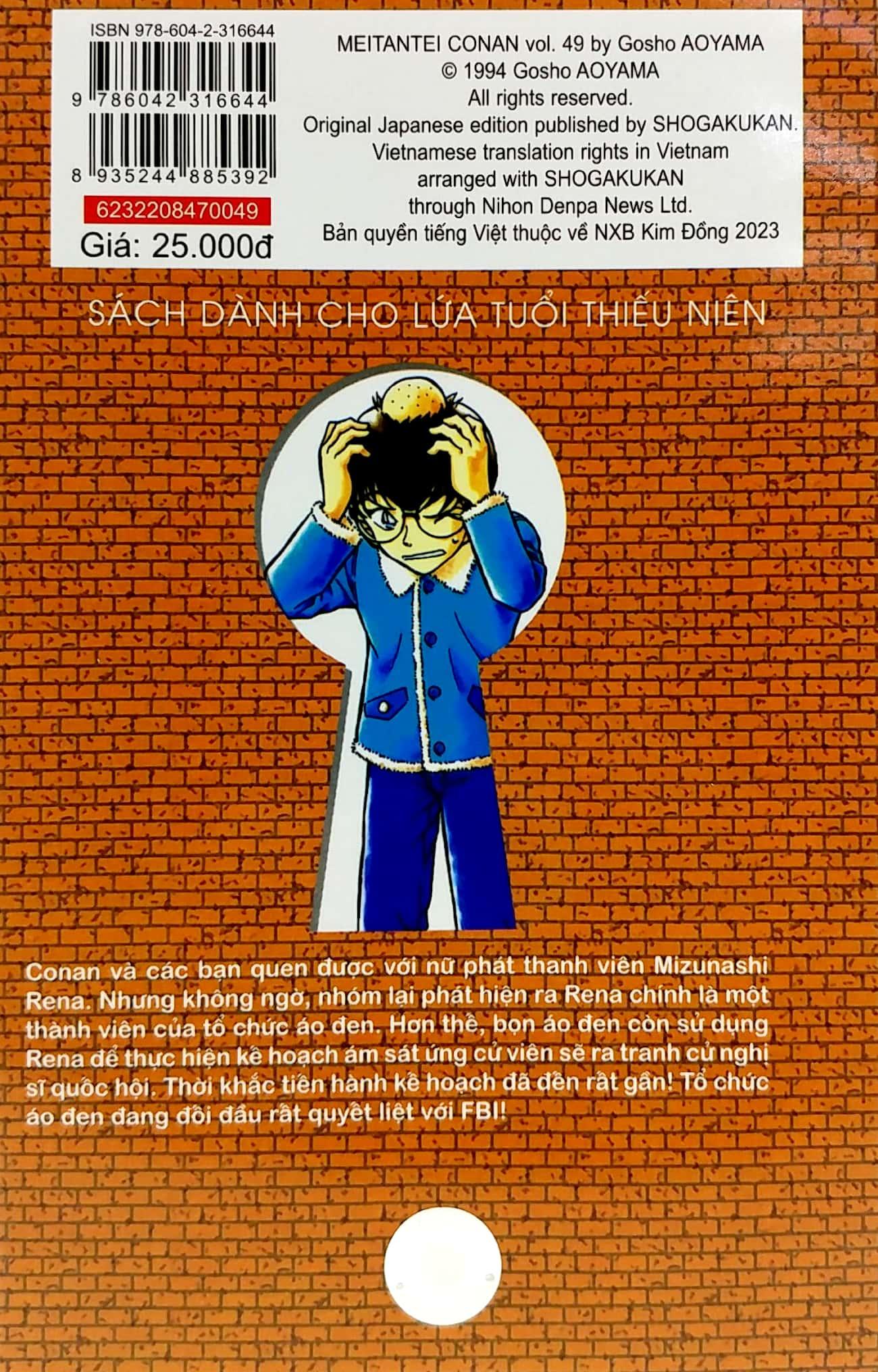 Thám Tử Lừng Danh Conan - Tập 49 Conan và các bạn quen được với nữ phát thanh viên Mizunashi Rena. Nhưng không ngờ, nhóm lại phát hiện ra Rena chính là một thành viên của tổ chức áo đen. Hơn thế, bọn áo đen còn sử dụng Rena để thực hiện kế hoạch ám sát ứng cử viên sẽ ra tranh cử nghị sĩ quốc hội. Thời khắc tiến hành kế hoạch đã đến rất gần! Tổ chức áo đen đang đối đầu rất quyết liệt với FBI! Gosho Aoyama Xin chào, tôi là Aoyama đây!! Chắc tại tôi già rồi (cười) nên dạo này rất khổ sở vì bệnh đau lưng, đến mức đành phải mua cái ghế massage. Xử lí nốt công việc, đi tắm, thay đồ ngủ, chuẩn bị xong tất cả mọi việc rồi… bật công tắc! Ngay lập tức tôi sẽ nghe thấy câu “xin mời đến với không gian thư giãn”…