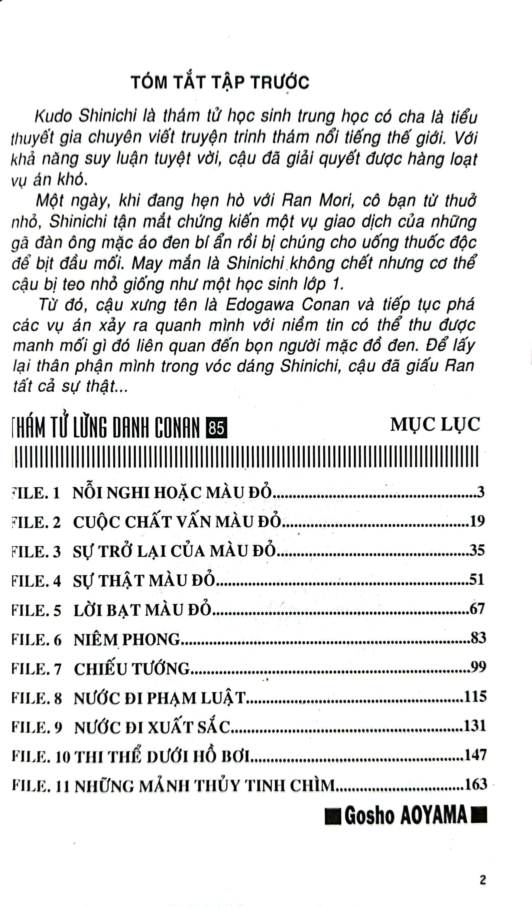 Mua tại TiktokThám Tử Lừng Danh Conan - Tập 85 Cuối cùng series "Màu đỏ" tiết lộ "sự thật trên đèo Raiha" cũng lên sóng! Điều mà các fan Conan mong đợi bấy lâ một bí ẩn tuyệt mật sẽ được bật mí! Bên cạnh đó, "vụ án giải đấu Danh nhân" nơi Conan sẽ cùng Danh nhân Taiko - Shukichi Haneda đương đầu với những mật mã hóc búa, cùng vụ án thi thể biến mất và xuất hiện dưới hồ bơi đầy bikini sặc sỡ, với sự trở lại của Sera và cô "em gái ngoài lãnh địa" cũng hứa hẹn nhiều điều bất ngờ!