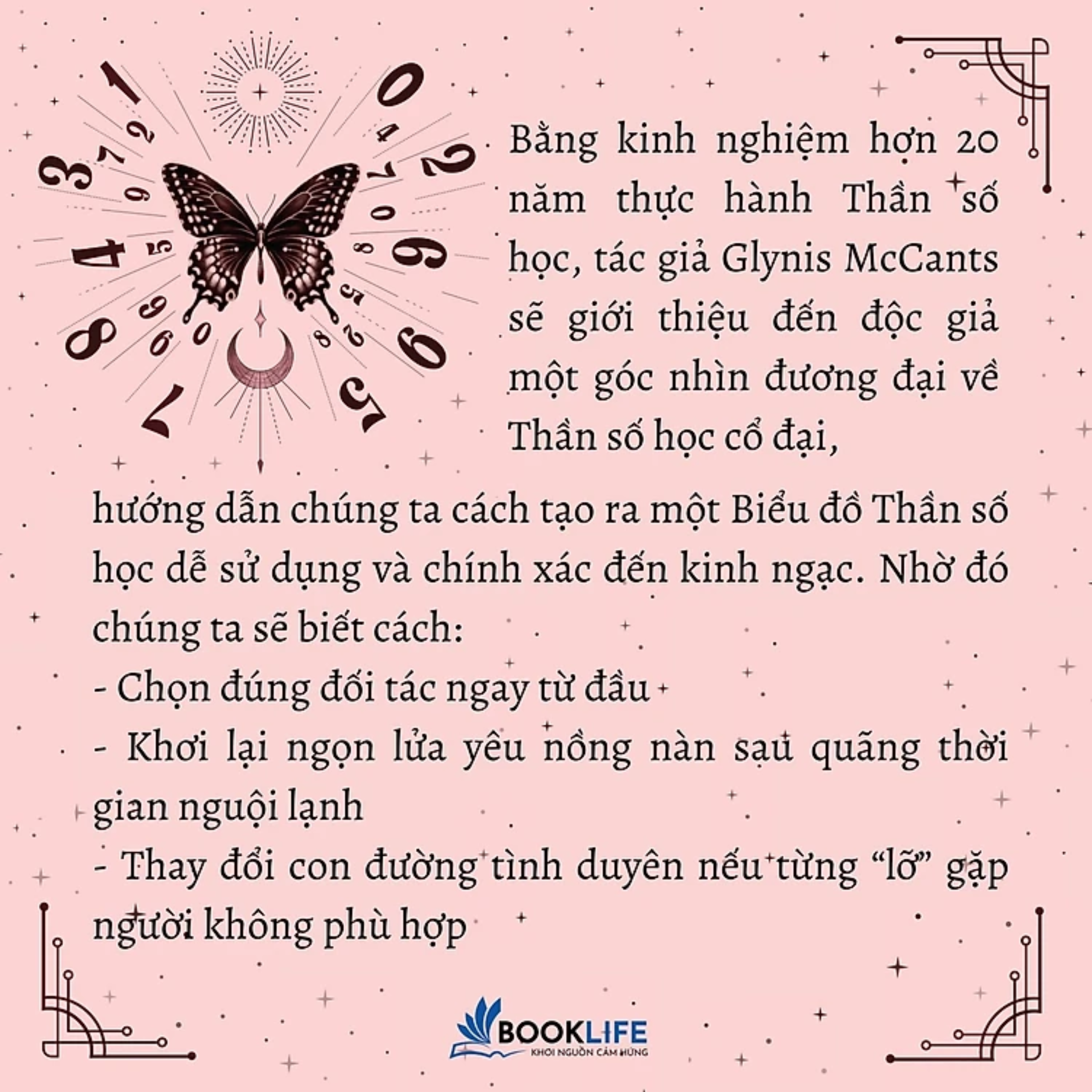 Cuốn sách đưa người đọc tiếp cận bằng những câu hỏi cơ bản nhất, bàn luận về các vấn đề có thể nảy sinh và hướng dẫn giải quyết chúng bằng cách áp dụng các phương pháp Thần số học đơn giản. Với những luận điểm chặt chẽ, ví dụ minh họa đầy đủ và nhiều bình luận không kém phần dí dỏm; cuốn sách trở nên sinh động, dễ đọc và cuốn hút hơn bao giờ hết. Bằng kinh nghiệm hơn 20 năm thực hành Thần số học, tác giả Glynis McCants sẽ giới thiệu đến độc giả một góc nhìn đương đại về Thần số học cổ đại, hướng dẫn chúng ta cách tạo ra một Biểu đồ Thần số học dễ sử dụng và chính xác đến kinh ngạc.