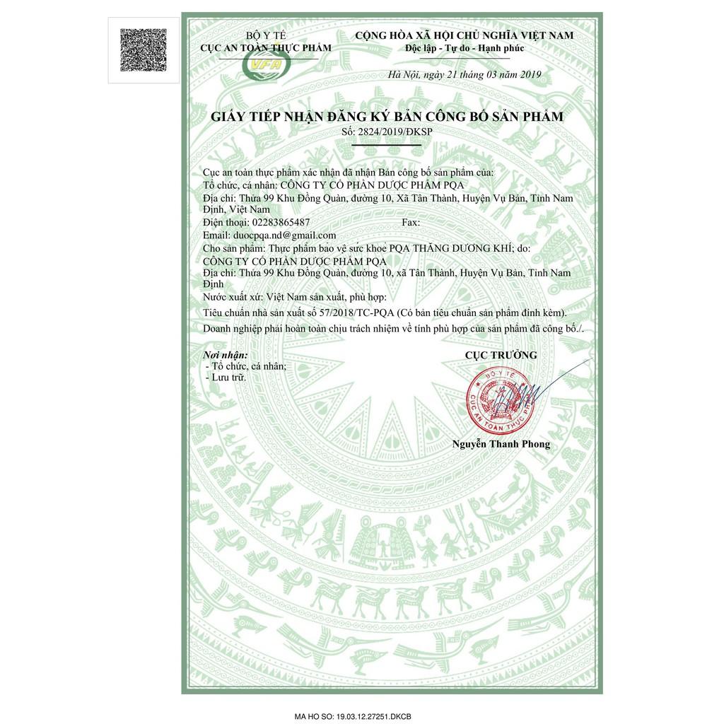 - Địa chỉ sản xuất: Công ty Cổ phần Dược phẩm PQA. Thửa 99, Khu Đồng Quàn, Xã Tân Thành, Huyện Vụ Bản, Tỉnh Nam Định. THÀNH PHẦN: