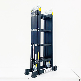 - Kích thước đóng gói: 124x35x26cm- Chiều cao tối đa chữ A: 2.26m- Chiều cao tối đa duỗi thẳng chữ I: 4.70m- Chiều cao khi xếp chữ U ngược: 1.25m- Chiều cao rút gọn: 1.23m- Trọng lượng: 14kg- Số bậc: 4x4 bậc- Khoảng cách giữa các bậc : 28cm- Chất liệu: Nhôm, được sơn tĩnh điện màu đen.- Tải trọng: 150kg- Tiêu chuẩn châu âu EN131, EN14183, CE.