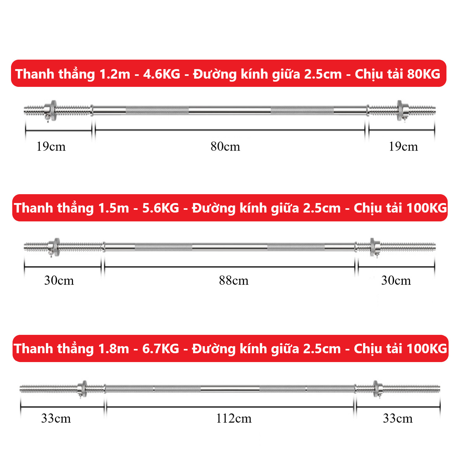 *** Thông tin sản phẩm thanh đòn tạ: > Thanh đòn tạ loại thẳng > Chiều dài: 1.2m hoặc 1.5m > Chất liệu: Thép đặc mạ inox > Cân nặng: 4.6KG hoặc 5.6KG >