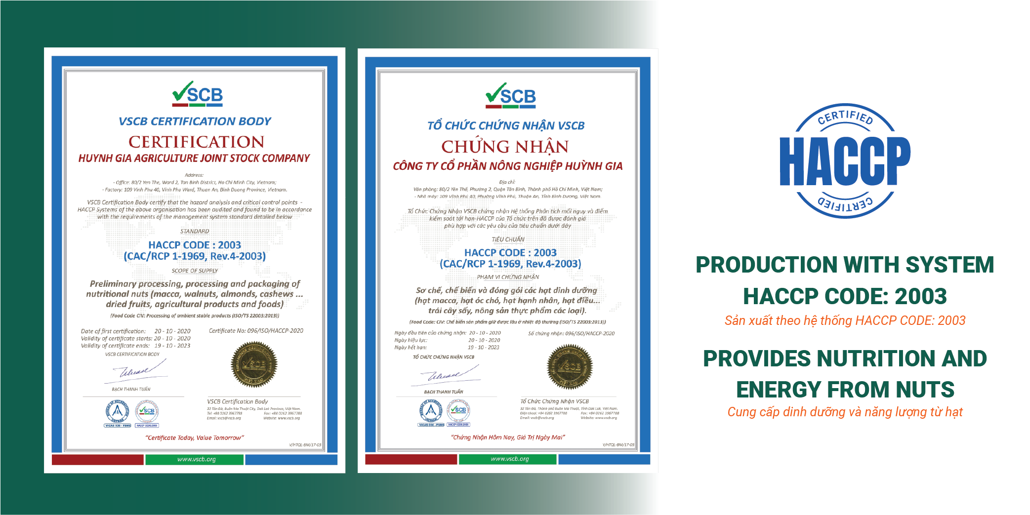 Tất cả nguyên liệu đầu vào được chọn lọc theo tiêu chuẩn khắt khe và được sản xuất tại nhà máy đạt tiêu chuẩn quốc tế HACCP, ISO 22000:2018.