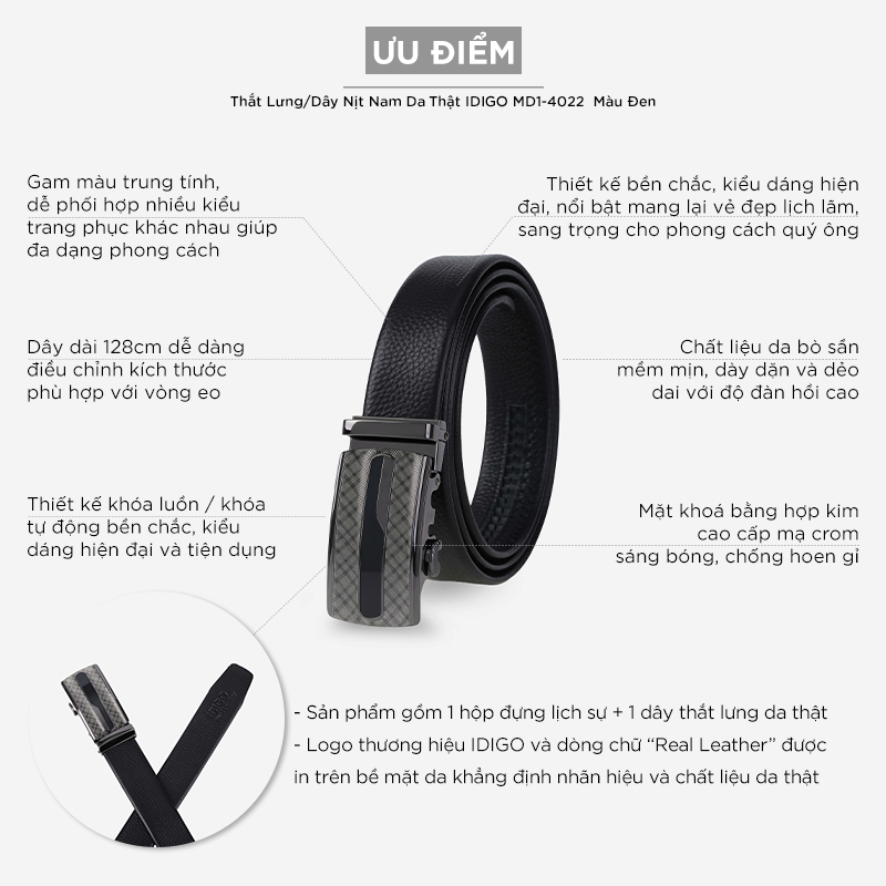 – Trọn bộ sản phẩm gồm: Thắt lưng nam da thật IDIGO-MD1-4022 + Hộp đựng sang trọng