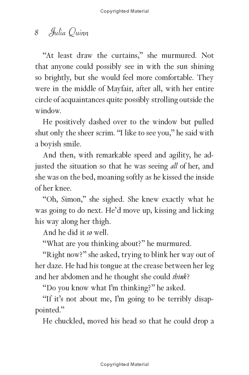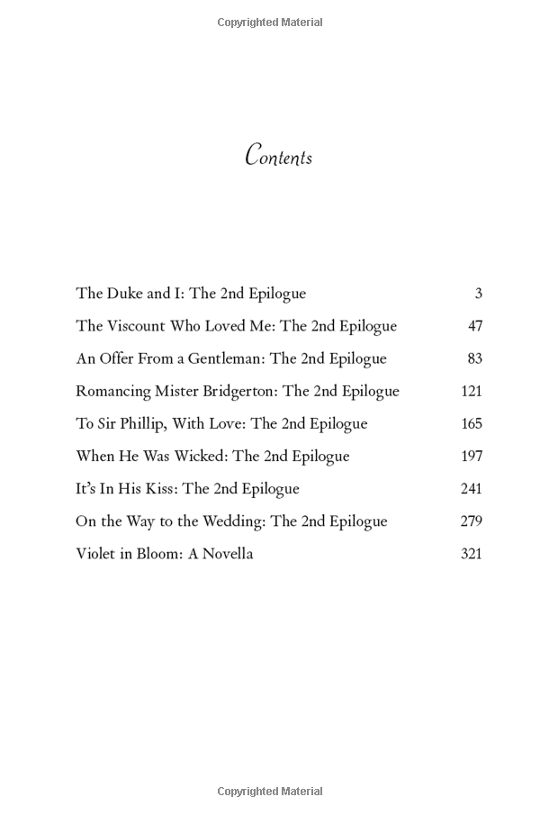 Also unique to this volume is a novella featuring Violet Bridgerton, beloved mother of the eight Bridgerton siblings, in addition to second epilogues for The Duke and I; The Viscount Who Loved Me; An Offer from a Gentleman; Romancing Mister Bridgerton; To Sir Phillip, With Love; When He Was Wicked, It’s in His Kiss; and On the Way to the Wedding sure to satisfy the legions of Julia Quinn fans.