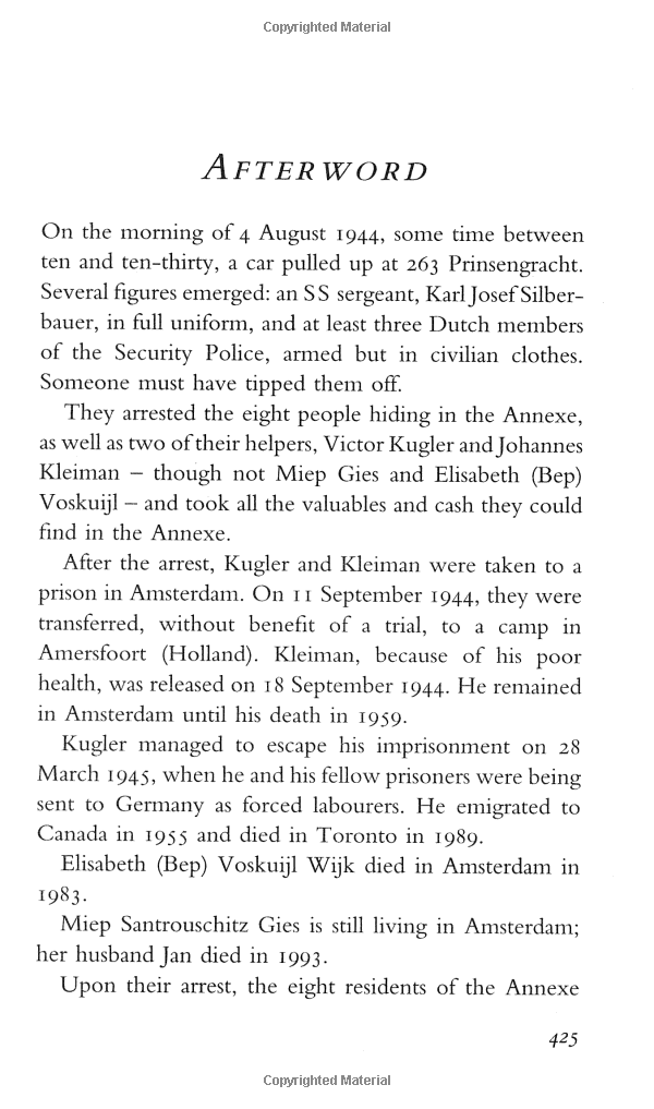 In July 1942, thirteen-year-old Anne Frank and her family, fleeing the horrors of Nazi occupation, went into hiding in an Amsterdam warehouse. Over the next two years, Anne vividly describes not only the daily frustrations of living in such close quarters, but also her thoughts, feelings and longings as she grows up. Her diary ends abruptly and tragically when, in August 1944, Anne and her family were all finally betrayed .