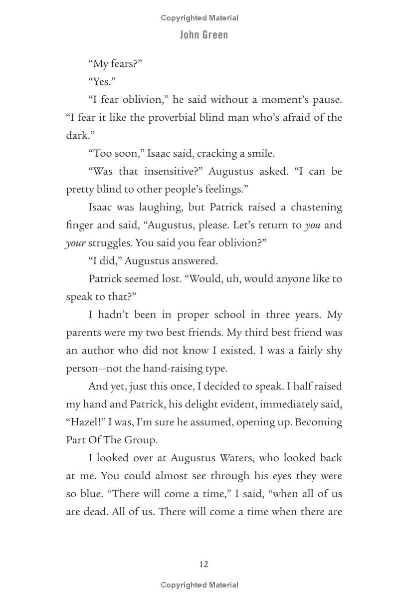Despite the tumor-shrinking medical miracle that has bought her a few years, Hazel has never been anything but terminal, her final chapter inscribed upon diagnosis. But when a gorgeous plot twist named Augustus Waters suddenly appears at Cancer Kid Support Group, Hazel's story is about to be completely rewritten.