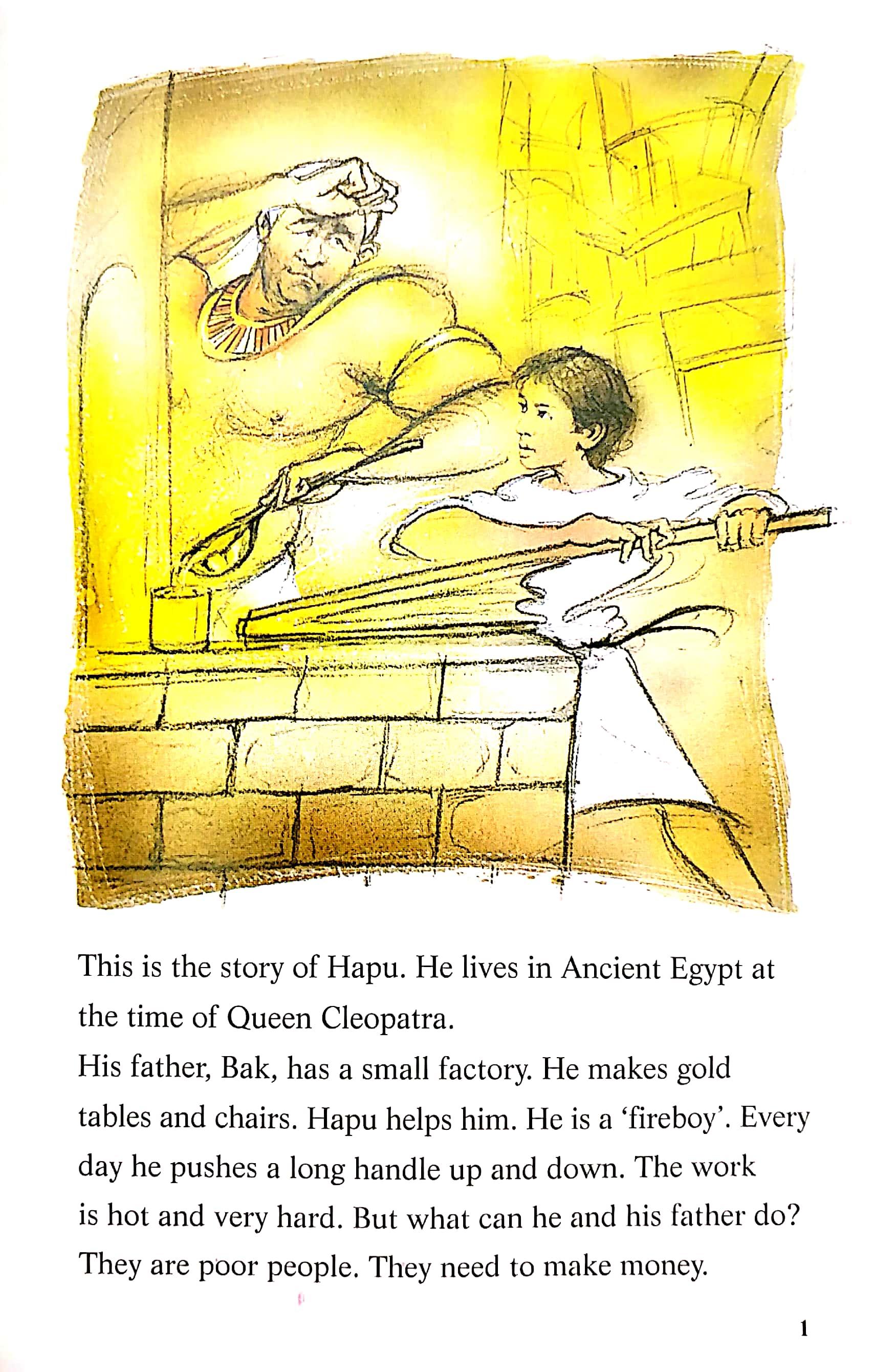 Original / British English Hapu lives in Ancient Egypt. Hapu's father is ill, but they haven't got any money for a doctor. Hapu makes a beautiful necklace for Queen Cleopatra and takes it to her.