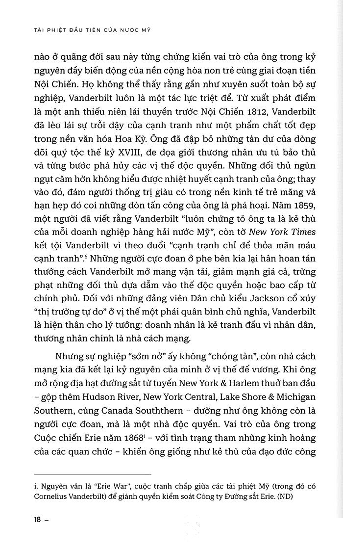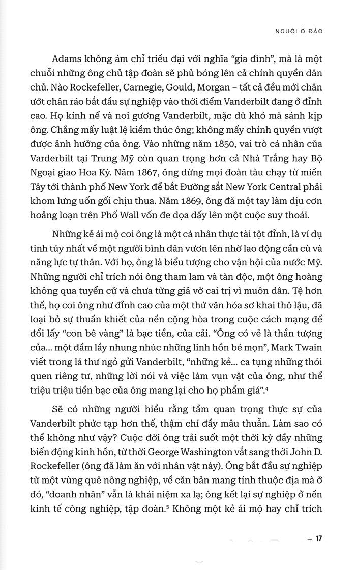 “Thế nhưng, có lẽ ông để lại dấu ấn lâu dài nhất trong thế giới vô hình, nhờ tạo ra một kiến trúc không thể thấy bằng mắt mà hậu thế nước Mỹ sẽ coi là đương nhiên. Tư duy kinh tế hiện đại nổi lên khi Vanderbilt còn tại thế, giữa những tranh cãi dữ dội, những bối rối hoang mang và kháng cự mãnh liệt. Những công cụ thương nghiệp tưởng tượng dần dần trừu tượng hóa những công cụ hữu hình thành các biểu tượng thuần túy, và thậm chí còn ít hơn thế. Tiền biến hình đổi dạng, từ đồng xu vàng sang những tờ ngân phiếu đảm bảo bằng vàng thành những xấp tiền giấy pháp định và các khoản mục ngân hàng trong sổ cái. Tài sản biến đổi, từ các đối tượng vật lý hữu hình thành cổ phần trong các liên doanh, đến cổ phiếu ở mức mệnh giá cho tới chứng khoán biến động theo nhịp điệu thị trường với số lượng có thể tăng tùy ý. Như một hồn ma, doanh nghiệp thoát ra từ cái xác nghiệp chủ cá nhân, để rồi tự nó trở thành một thực thể, một tập đoàn với bản sắc, cá tính và nhân trạng riêng.”