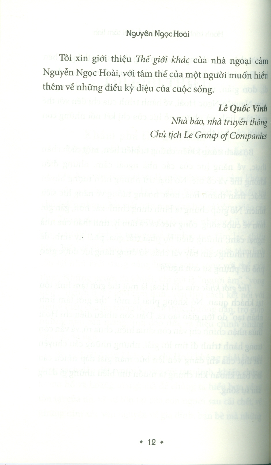 "Thế giới khác 1: Hành trình khám phá thế giới tâm linh" chính là một phần minh chứng cho sự tồn tại của một thế giới tâm linh hiện diện qua từng con chữ. Thế giới tâm linh tồn tại. Thế giới ấy không phải là sự huyễn hoặc của tâm tưởng và niềm tin một chiều của con người, hay qua sự thêu dệt của dân gian, hay chỉ là lớp áo dày và trang trọng khoác bên ngoài các lễ nghi, tập tục như một văn hóa lâu đời của con người, bất chấp niềm tin và tư tưởng ngược chiều của con người vào vô thần và hữu thần.