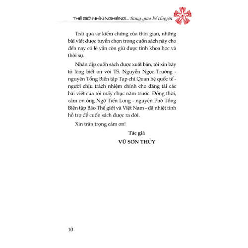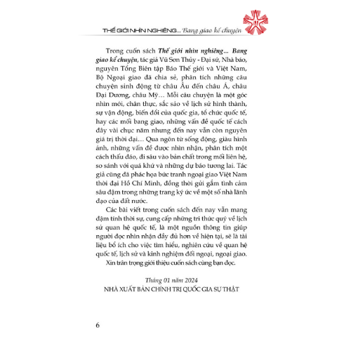 Mua tại TiktokTrong cuốn sách Thế giới nhìn nghiêng… Bang giao kể chuyện, tác giả đã chia sẻ, phân tích những câu chuyện sinh động từ châu Âu đến châu Á, châu Đại Dương, châu Mỹ… mỗi câu chuyện là một góc nhìn chân thực, sắc sảo về lịch sử hình thành, sự vận động, biến đổi của quốc gia, tổ chức quốc tế, hay các mối bang giao, những vấn đề quốc tế cách đây vài chục năm nhưng đến nay vẫn nguyên giá trị thời đại…