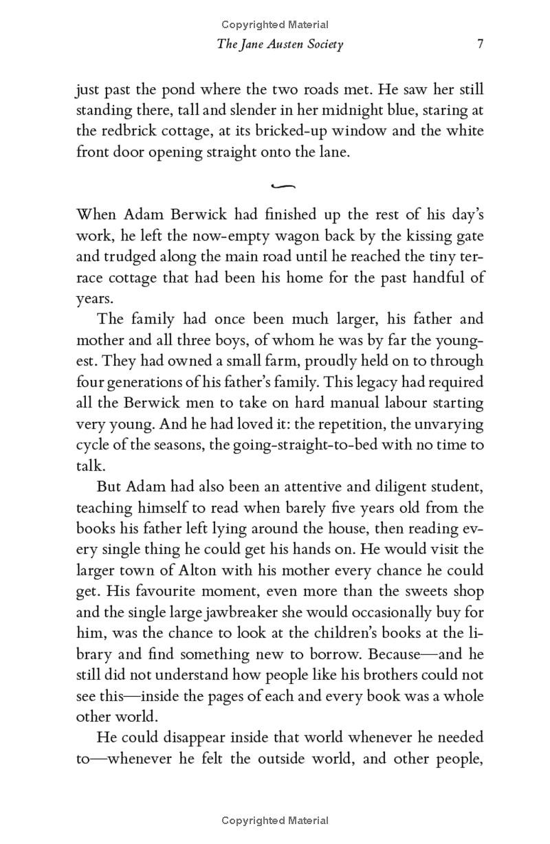 One hundred and fifty years ago, Chawton was the final home of Jane Austen, one of England's finest novelists. Now it's home to a few distant relatives and their diminishing estate. With the last bit of Austen's legacy threatened, a group of disparate individuals come together to preserve both Jane Austen's home and her legacy. These people-a laborer, a young widow, the local doctor, and a movie star, among others-could not be more different and yet they are united in their love for the works and words of Austen. As each of them endures their own quiet struggle with loss and trauma, some from the recent war, others from more distant tragedies, they rally together to create the Jane Austen Society.