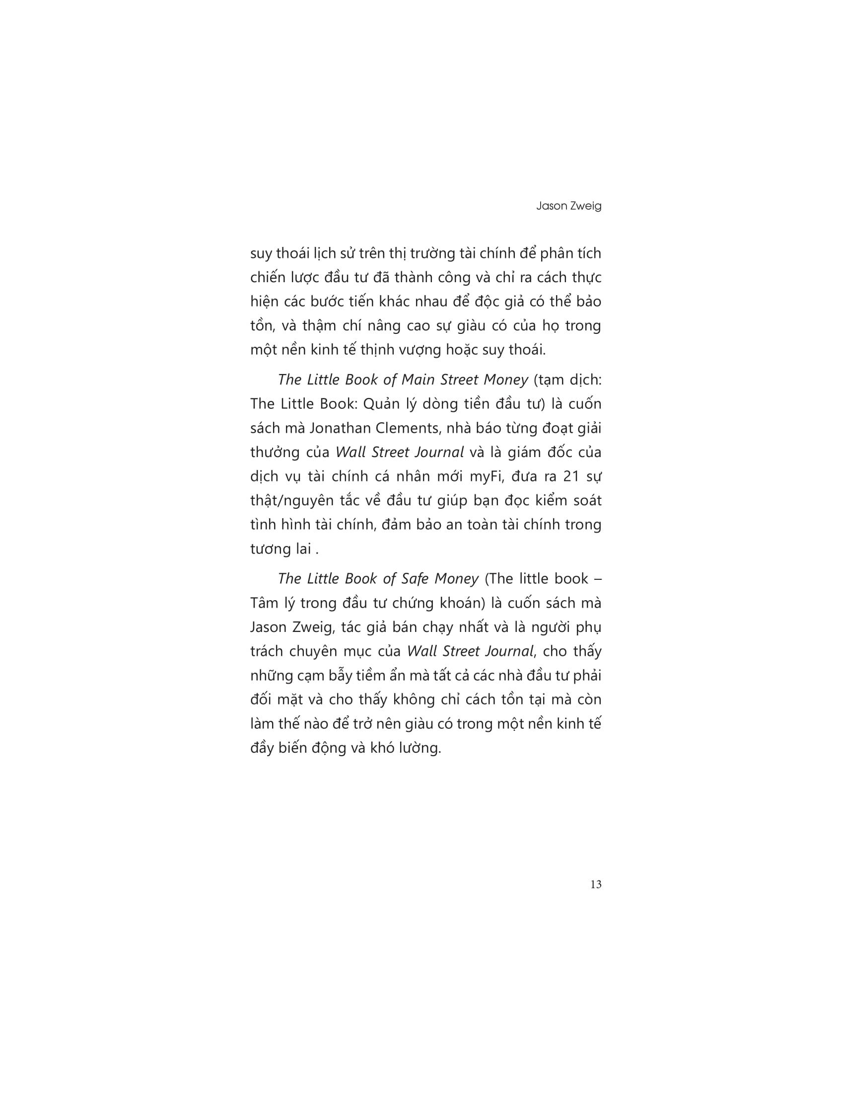 Jason Zweig là người phụ trách chuyên mục đầu tư và tài chính cá nhân của The Wall Street Journal. Trước đây, ông là cây viết cấp cao của tạp chí Money, biên tập viên quỹ tương hỗ tại tạp chí Forbes, và là khách mời của chuyên mục Time and . Ông là người biên tập ấn bản sửa đổi của cuốn “Nhà đầu tư thông minh” của Benjamin Graham, văn bản kinh điển mà Warren Buffett gọi là "cuốn sách hay nhất về đầu tư từng được viết cho đến nay." Ông cũng là tác giả của “Từ điển tài chính của quỷ”, một bảng chú giải châm biếm các thuật ngữ của Phố Wall, và “Tiền và bộ não của bạn”, về khoa học thần kinh và tâm lý học trong quá trình ra quyết định tài chính. Zweig làm việc trong ban biên tập của tạp chí Lịch sử Tài chính và Tạp chí Tài chính Hành vi.