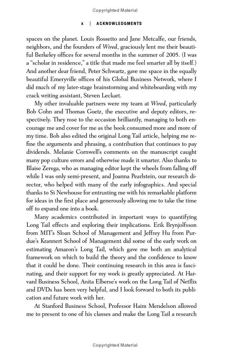 The Long Tail is a powerful new force in our economy: the rise of the niche. As the cost of reaching consumers drops dramatically, our markets are shifting from a one-size-fits-all model of mass appeal to one of unlimited variety for unique tastes. From supermarket shelves to advertising agencies, the ability to offer vast choice is changing everything, and causing us to rethink where our markets lie and how to get to them. Unlimited selection is revealing truths about what consumers want and how they want to get it, from DVDs at Netflix to songs on iTunes to advertising on Google.