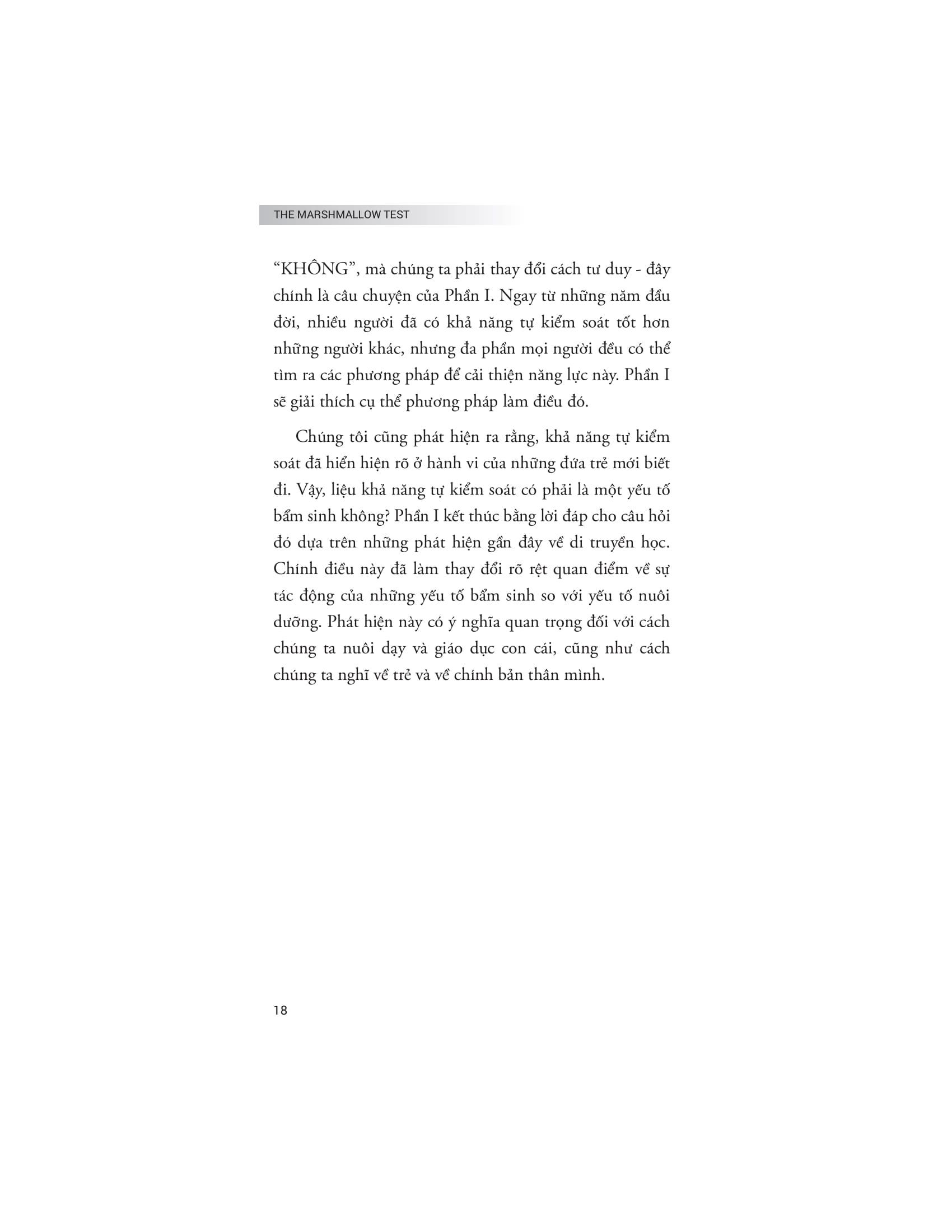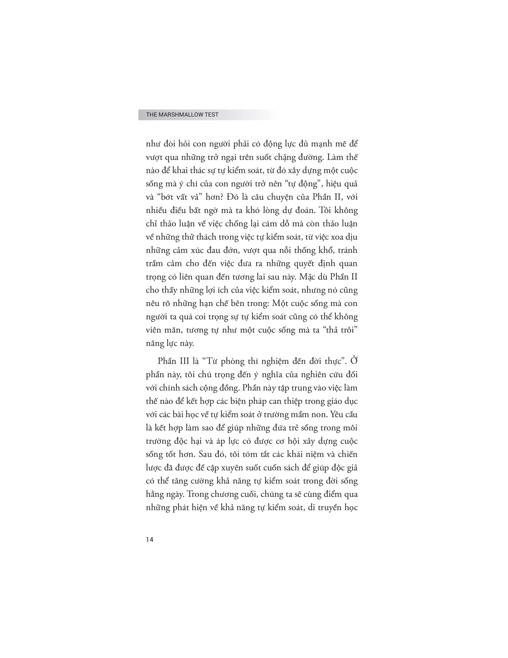 Bằng cách ứng dụng những bài học từ thí nghiệm kẹo dẻo vào cuộc sống thực tế, The Marshmallow Test không chỉ giúp người đọc hiểu rõ hơn về bản chất của tự kiểm soát mà còn cung cấp những cách thức và chiến lược hữu ích để rèn luyện khả năng này. Cuốn sách phân tích cách sự kiểm soát bản thân có thể ảnh hưởng đến nhiều khía cạnh trong cuộc sống, từ việc duy trì sức khỏe tốt, xây dựng sự nghiệp thành công đến phát triển các mối quan hệ cá nhân bền vững. Rất nhiều khía cạnh thú vị và ý nghĩa về năng lực tự chủ đã được các nhà nghiên cứu dày công tìm hiểu. Kết quả rút ra từ công trình này – sẽ giúp các bạn độc giả có một cái nhìn toàn cảnh và chuyên sâu về một trong những kỹ năng thiết yếu nhất của con người.