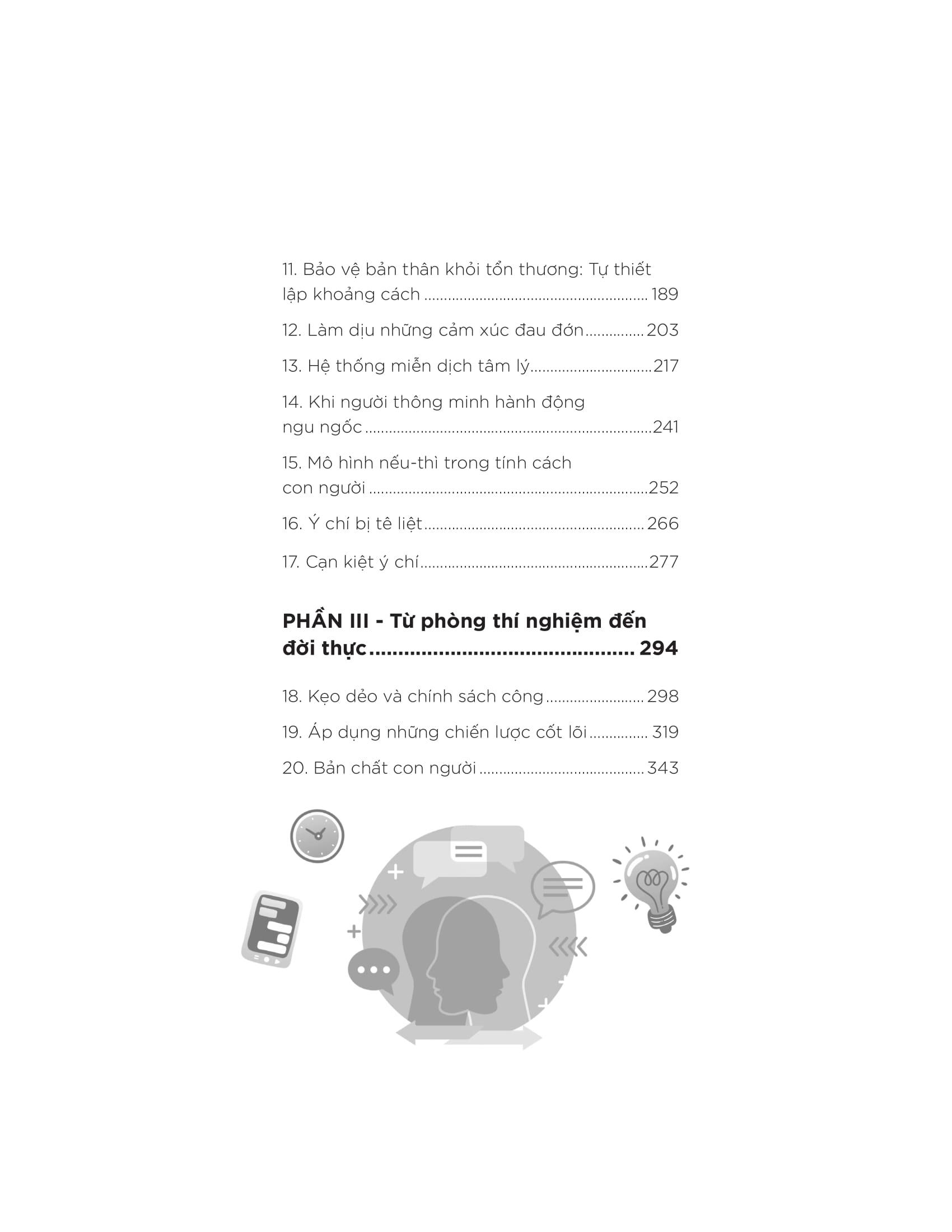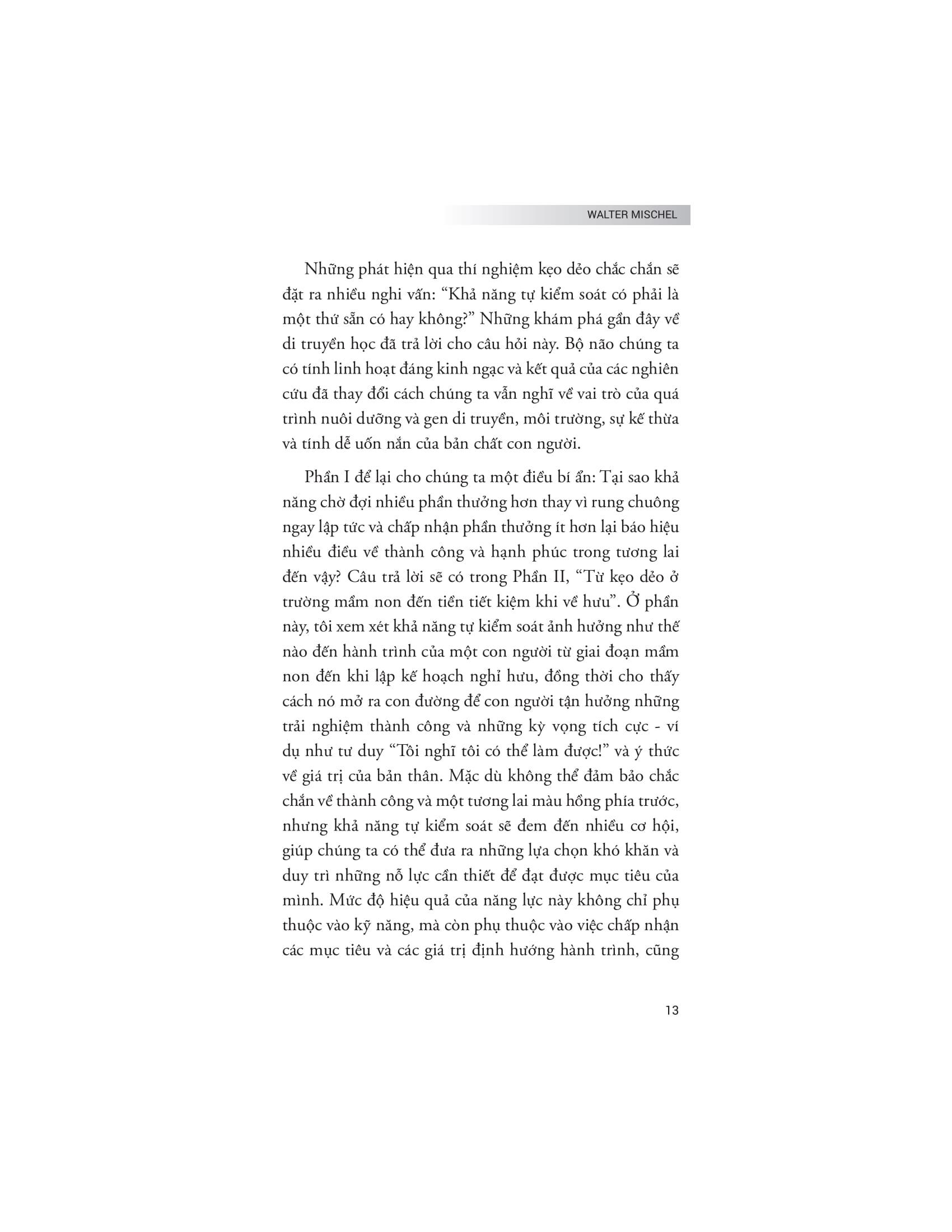 Tác giả Walter Mischel đi sâu vào phân tích các chiến lược và phương pháp giúp cải thiện khả năng tự kiểm soát, từ việc xây dựng ý chí mạnh mẽ đến việc áp dụng các chiến lược tinh thần để đối phó với cám dỗ và duy trì kiên nhẫn. Bên cạnh đó, tác giả cũng chỉ ra những yếu tố ảnh hưởng đến ý chí và sự kiểm soát bản thân, từ môi trường, cách giáo dục đến các yếu tố tâm lý cá nhân.