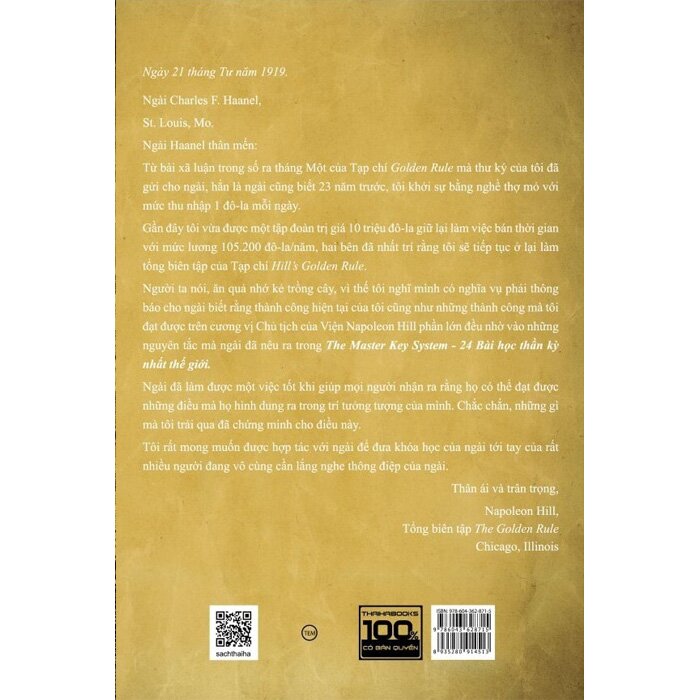 The Master Key System không đơn giản chỉ là một cuốn sách hướng dẫn cách trở thành một nhân viên hay một nhà sản xuất tốt, nó không dừng lại ở việc giúp bạn cải thiện tình hình tài chính. The Master Key System mở ra cánh cửa dẫn tới sự thành công toàn diện bao gồm các khía cạnh thân thể, tâm trí, và tinh thần. Trọng tâm của cuốn sách là làm sao để biến một người trở nên vĩ đại. Những ý tưởng và sự quan sát của Haanel tương tự với những ý tưởng đã dẫn dắt các bộ óc thiên tài như Van Gogh, Carnegie, Gates, và Buffet. The Master Key System sẽ giúp bạn khai thác sự thiên tài của chính mình.