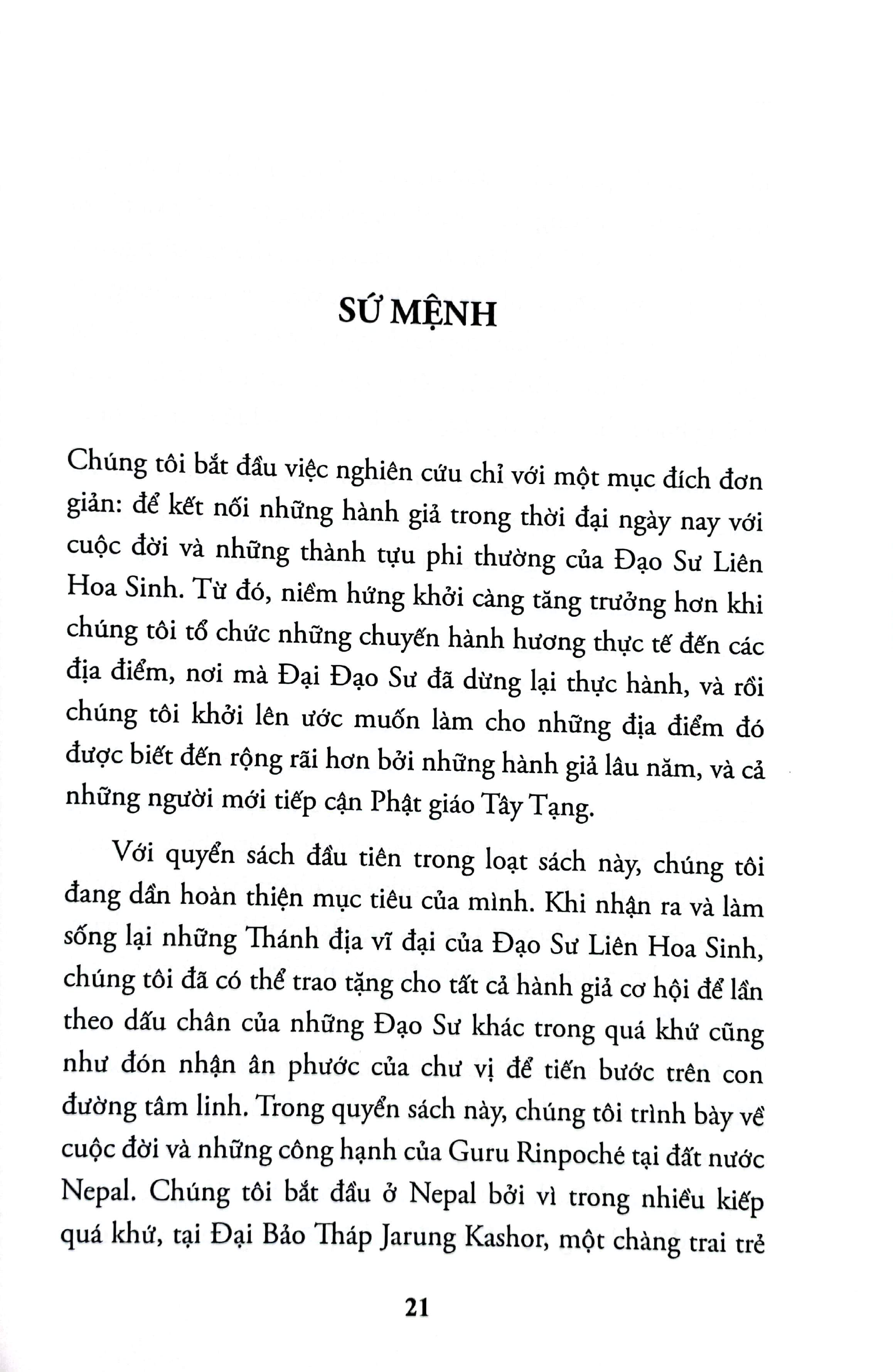 Quyển sách Theo Chân Đạo Sư: Đức Liên Hoa Sinh Ở Nepal trình bày những kỳ công phi thường ngoài sức tưởng tượng của Đạo Sư Padmasambhava ở Nepal, thuộc vùng đất Hy Mã Lạp Sơn. Vị Hóa thân này tượng trưng cho sự giác ngộ theo con đường Mật thừa. Ngài đã dành nhiều năm nhập thất miên mật tại những vùng núi đồi và thung lũng nơi đây. Đại Đạo Sư cũng đã ban vô số giáo huấn cho chúng môn đồ và chôn giấu số lượng Mật điển nhiều vô kể.