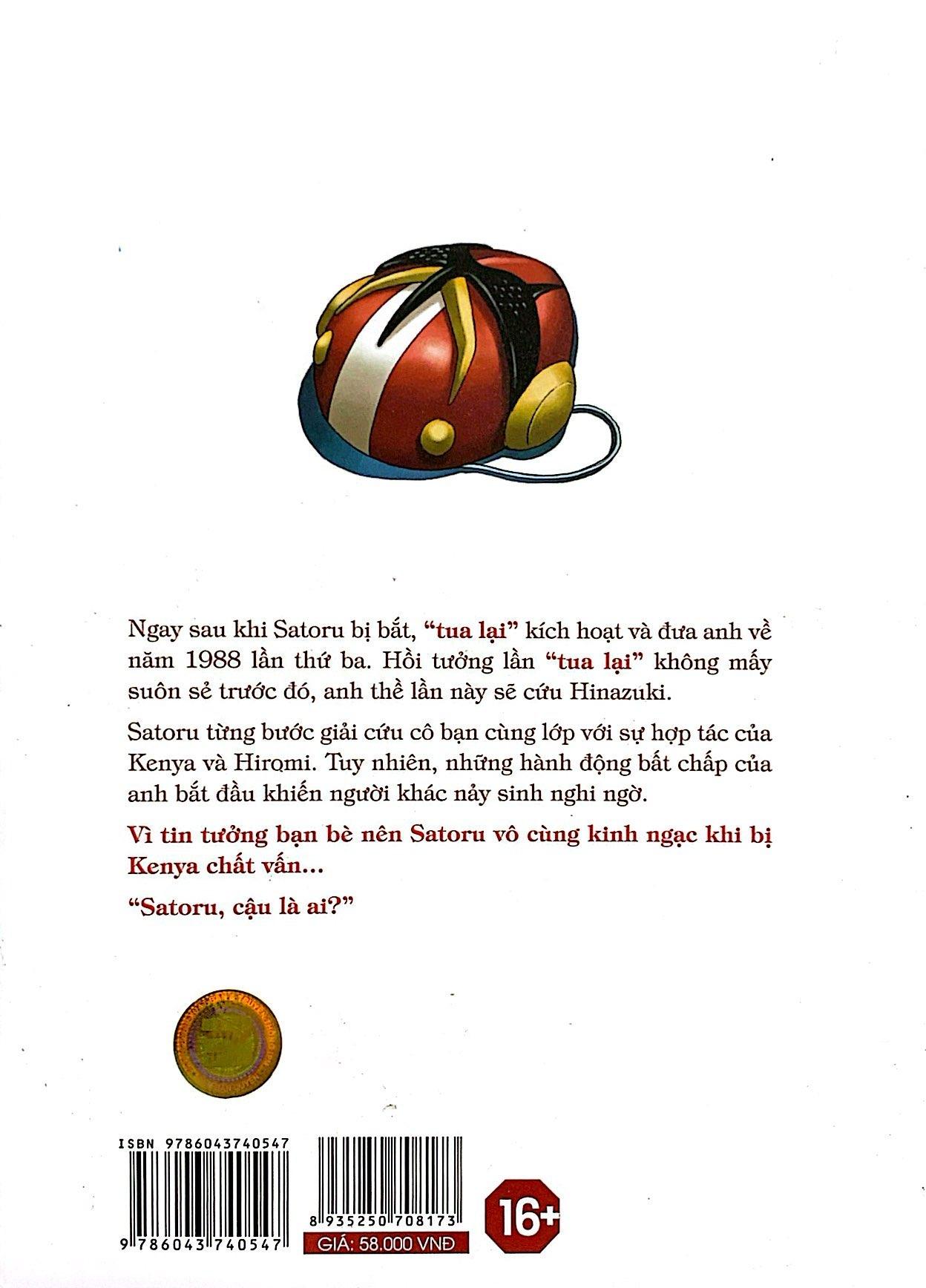 Mua tại TiktokNỗ lực tìm kiếm hung thủ thật sự đã thất bại, Satoru bị cảnh sát bắt. Tuy nhiên, “tua lại” đã kích hoạt và đưa anh về năm 1988 một lần nữa. Rút kinh nghiệm từ thất bại trước đó, Satoru quyết tâm dùng mọi cách để cứu Hinazuki bất chấp việc đưa chính bản thân vào nguy hiểm. Với sự giúp đỡ ngoài dự đoán từ người bạn cùng lớp, liệu Satoru có thể phá được vòng luẩn quẩn của vụ án bắt cóc, giết người hàng loạt không? Hãy cùng đón đọc tập 4 của Thị trấn vắng mình tôi.
