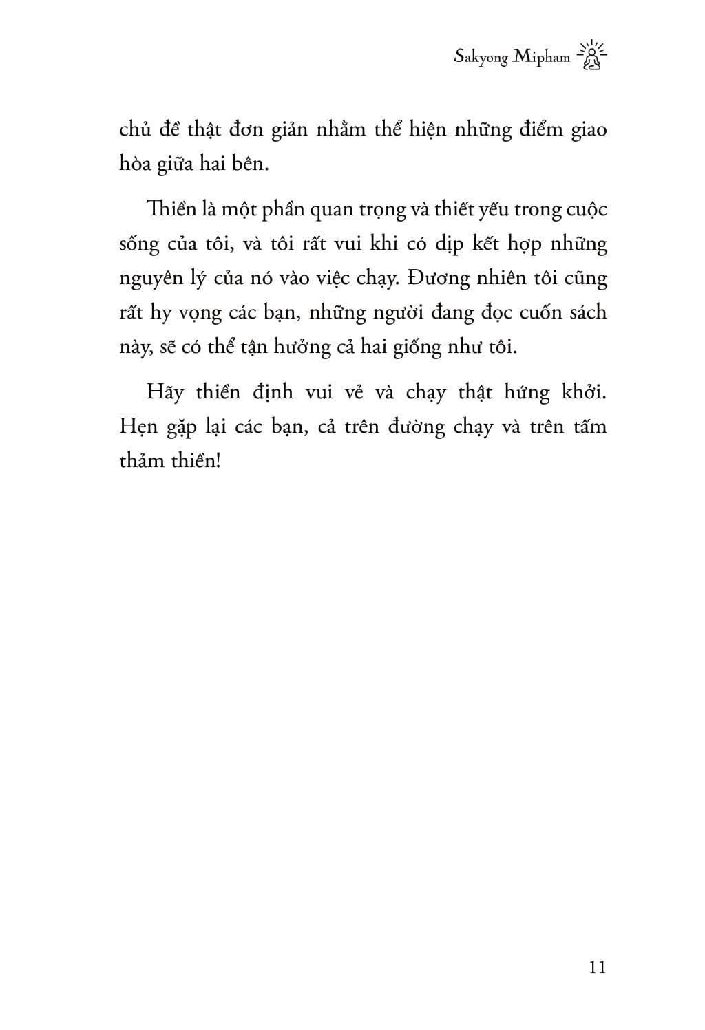 Tác giả không chỉ đưa ra những nguyên tắc thiền cơ bản mà ông đã đúc kết từ nhiều năm tu tập, mà còn chỉ rõ rằng bất cứ ai – không phân biệt độ tuổi, thể trạng hay trình độ – đều có thể thực hành việc kết hợp giữa thiền và chạy bộ. Thông qua những hướng dẫn cụ thể và lời khuyên sâu sắc, ông giúp người đọc hiểu cách tạo ra sự hòa hợp giữa cơ thể và tâm trí, từ đó đạt được sự bình an và cân bằng trong cuộc sống.