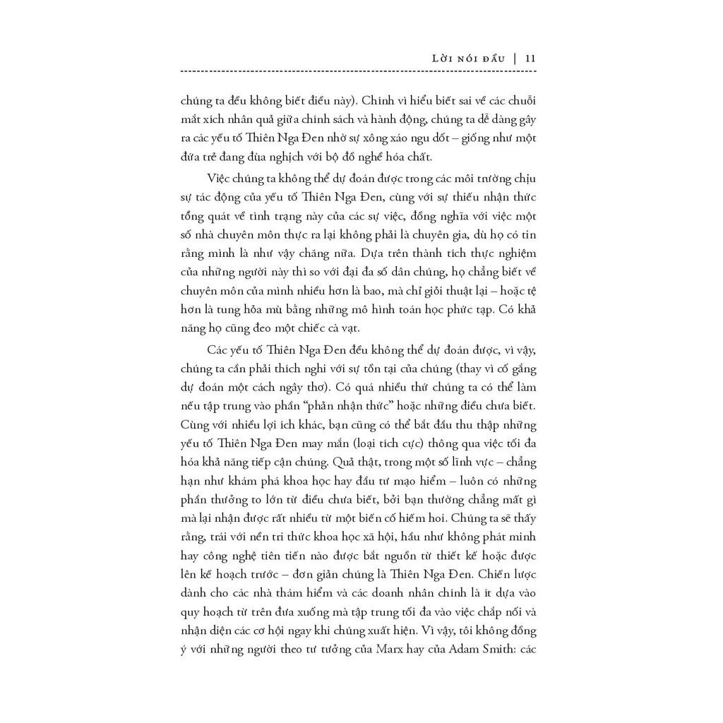 Chúng ta không biết rất nhiều thứ nhưng lại hành động như thể mình có khả năng dự đoán được mọi điều. Và trong cuốn sách này, tác giả Nassim Nicholas Taleb đã đi sâu vào khai thác những sai lầm của tư tưởng cố hữu ấy. Theo ông, “thiên nga đen” là một biến cố tưởng chừng như không thể xảy ra với ba đặc điểm chính: không thể dự đoán, có tác động nặng nề và sau khi nó xảy ra, người ta lại dựng lên một lời giải thích để khiến nó trở nên ít ngẫu nhiên hơn, dễ dự đoán hơn so với bản chất thật của nó. Thành công đáng kinh ngạc của Fb có thể được coi là một “thiên nga đen”, việc nước Anh rời khỏi Liên minh châu u cũng là một “thiên nga đen”. Thiên nga đen luôn ẩn hiện trong mọi mặt của cuộc sống với những tác động khó lường, theo cả hướng tiêu cực và tích cực.