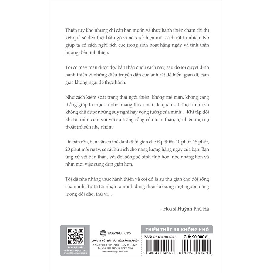 Tôi đọc Thiền thật ra không khó, muốn tìm cho mình một liều thuốc tinh thần. Sự giản dị của văn phong, chất khiêm nhường chân thành, tận tụy nghĩ cho người đọc của tác giả thật cảm động. Không muốn làm rối trí thêm những tâm trí đã bải hoải, người viết chọn cách "cầm tay chỉ việc" rất cụ thể, tỉ mỉ tới từng thao tác để ai cũng có thể bắt đầu học thiền từ động tác cụ thể, để rồi có thể tiến đến thiền trong tâm trí.