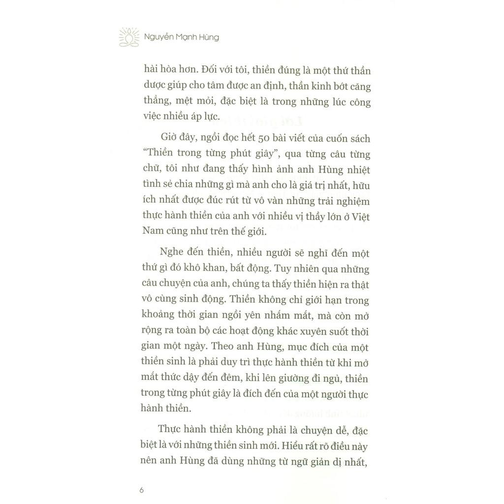 Cuốn sách gồm 50 phần tương ứng với 50 ngày tham gia khóa thiền “Bát Chánh Đạo” của thầy cùng một số bạn đồng môn. Đây là khóa thiền đặc biệt nhất mà tôi được biết và liên tục theo dõi vì ngày nào thầy cũng đưa 1 bài viết lên Facebook cá nhân chia sẻ về những gì thầy TRẢI NGHIỆM trong quá trình hành thiền. Sự đặc biệt nằm ở chỗ: Thứ nhất là rất hiếm có một khóa thiền nào diễn ra tận 50 ngày và thứ 2 là trải nghiệm của thầy không phải ngồi im để thiền 50 ngày này mà pháp hành “Thiền” của thầy diễn ra đan xen giữa những ngày thiền miên mật (từ 3h sáng tới 9h đêm với hơn 10 thời thiền, mỗi thời 1-2 tiếng liên tục không nghỉ) với những ngày thầy đi công tác nước ngoài hay ra chiến trường kinh doanh với những cảm thọ tuy “đời thường” nhưng lại là “khốc liệt nhất”. Đối với tôi, việc thực hành chánh niệm liên tục trong các thời thiền miên mật đã không hề dễ dàng với đại đa số “dân thiền” chuyên nghiệp, kể cả nhà tu hành. Chánh niệm lại càng thêm khó khăn bội phần khi chúng ta tiếp xúc với các ngoại cảnh cuộc sống phát sinh các cảm thọ nổi trội rất dễ dẫn tới các thất niệm làm mất sạch công phu thiền bao lâu. Sự thú vị của 50 ngày trải nghiệm “Thiền trong từng phút giây” chính xác nằm ở chỗ đó và đấy mới chính là thứ mà các thiền sinh cần nhất, một mối liên kết giữa Ẩn niệm (Chánh niệm khi thiền tọa miên mật ẩn cư) đến Hiện niệm (Chánh niệm trong cuộc sống hiện tại) cần được duy trì một cách xuyên suốt. Với 50 bài viết này, chúng ta sẽ cùng khám phá những kinh nghiệm giữ gìn chánh niệm liên tục của thầy qua các câu chuyện trải nghiệm thực tế với rất nhiều đổi cảnh tiêu biểu đã, đang và sẽ diễn tiến trong cuộc đời của bất cứ ai, nhất là những doanh nhân cư sĩ như thầy. Tất nhiên, đến với cuốn sách, nhiều thiền sinh khao khát được đọc các mô tả về các giai đoạn chứng ngộ thiền từ bậc sơ khởi đến các trạng thái giác ngộ sâu xa. Các bạn sẽ không phải thất vọng vì ngay những phần đầu tiên thầy đã chia sẻ các kinh nghiệm này và xuyên suốt 50 phần của cuốn sách các trạng thái chứng ngộ cũng được nhắc đi nhắc lại nhiều lần. Đây cũng là một tài liệu vô cùng quý giá mà theo đánh giá cá nhân của tôi thì từ trước tới nay chưa có một ai hay tài liệu nào ghi chép tỉ mỉ rõ ràng về kinh nghiệm hành thiền và các trải nghiệm rõ ràng mạch lạc từ thấp tới cao như cuốn sách này của thầy. Sự thú vị tiếp nối khi chúng ta thấy các ghi chép của thầy không chỉ đề cập về các trạng thái chứng ngộ khác nhau về Văn tuệ, Tư tuệ và Tu tuệ khi thực hành chánh niệm mà thầy còn trích dẫn chính xác các đoạn Kinh điển của Nikaya (Đại Tạng Kinh Nguyên Thủy) một cách khéo léo và đúng lúc làm cho người hành thiền dễ dàng hiểu sâu hơn về Pháp học Văn tuệ và thậm chí rút ngắn đi khá nhiều con đường tu tập nếu tự mình đọc Kinh điển và tự thực hành. Là một người có rất nhiều năm kinh nghiệm tu tập các tông phái thiền từ nhiều Thiền sư nổi tiếng, là một nhà khoa học, và cũng là người điều hành một doanh nghiệp nổi tiếng trong lĩnh vực lan toả tri thức thế giới đến với gần 100 triệu độc giả Việt Nam (Thái Hà Books), các bài viết của thầy Nguyễn Mạnh Hùng vừa toát ra hương vị thiền từ một lộ trình trải nghiệm thân chứng thực thụ, nhưng lại vô cùng logic khoa học và chính xác những gì thầy muốn dùng ngôn từ để truyền đạt. Cuốn sách “Thiền trong từng phút giây” sẽ vô cùng hữu ích cho những người tu thiền các trình độ khác nhau tra cứu các giai đoạn chứng ngộ của mình trong quá trình tu tập. Đây thực sự là một cuốn sách vô cùng quý báu cho chính tôi cũng như các đồng đạo làm cẩm nang gối đầu giường để dẫn chúng ta đi theo Thầy trên con đường Chánh niệm và tiến tới Đạo quả giải thoát cuối cùng như Đức Phật đã trải qua từ 2600 năm trước.