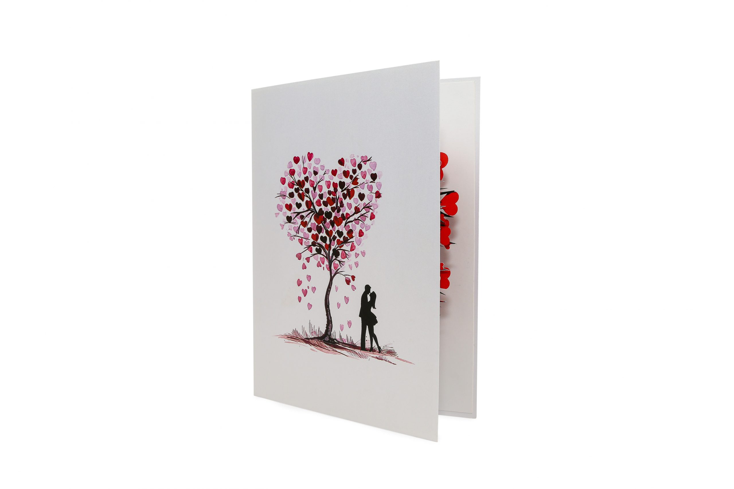 Thay lời muốn nói bằng thiệp 3D Pop Up Cây Tình Yêu độc đáo. Khi mở ra, hình ảnh cây tình yêu với tán lá trái tim đỏ rực bật nổi sống động, bên dưới