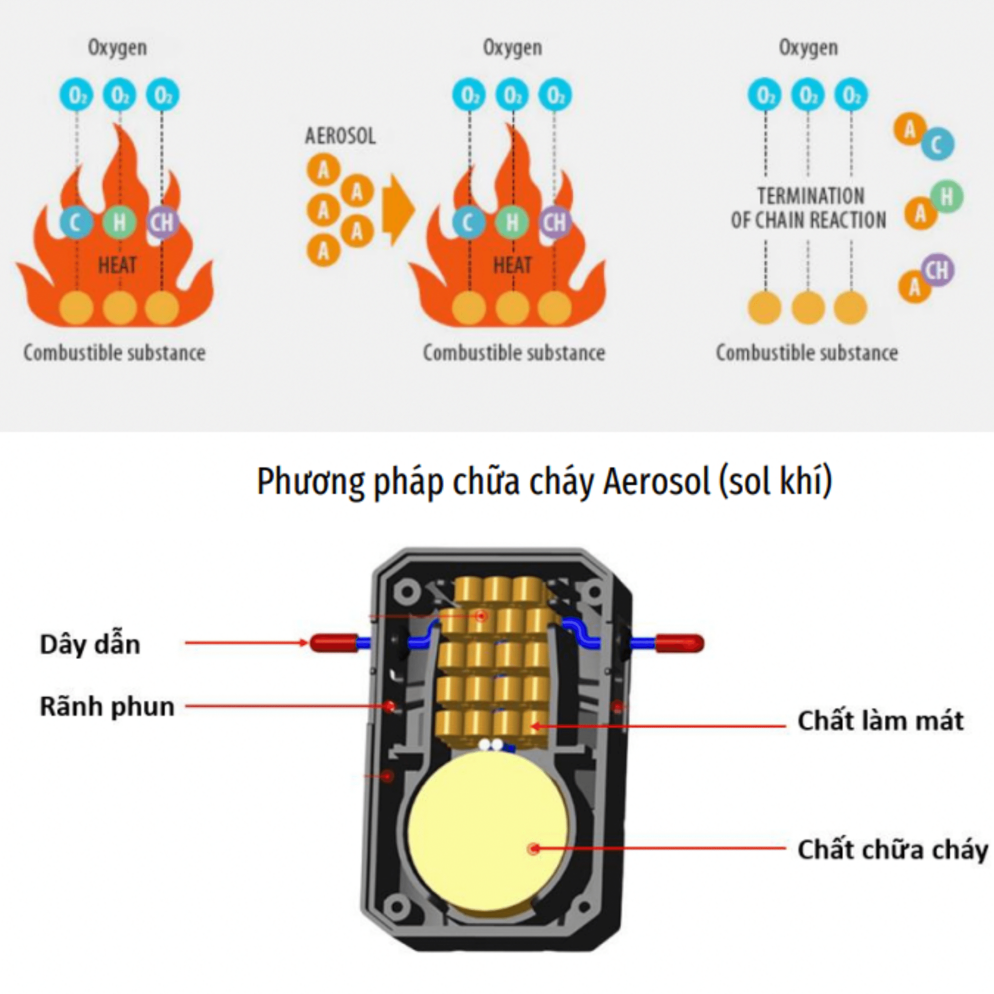 - Khi lửa tiếp xúc với đầu dây dẫn đồng thời nhiệt độ đạt đến ngưỡng dây mồi lửa hoạt động. ngọn lửa sẽ làm cháy dây mồi từ đó tạo ra phản ứng tạo sol khí để dập tắt ngọn lửa.