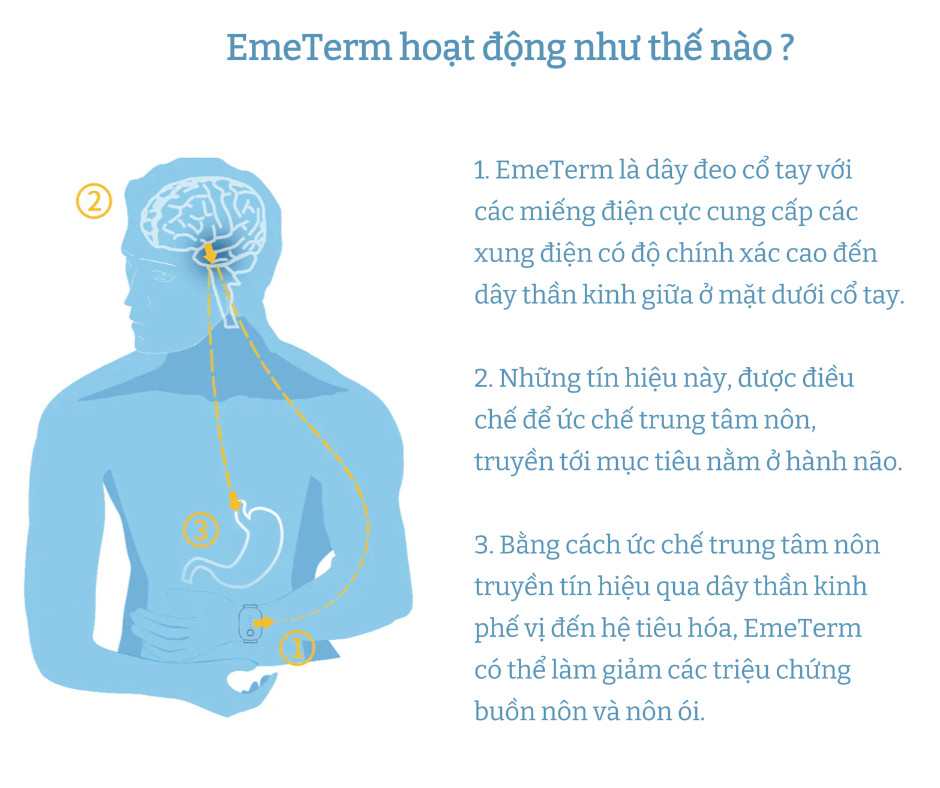 MÔ TẢ SẢN PHẨM   EmeTerm Explore là thiết bị đeo tay sử dụng công nghệ TENS (dùng các xung điện nhỏ và chính xác để  kích thích điện thần kinh không xâm lấn, bao gồm kích thích dây thần kinh điện xuyên da) giúp chống buồn nôn an toàn và hiệu quả, giúp ngăn ngừa và giảm buồn nôn và nôn mữa do say tàu xe (khi đi ô tô, thuyền hoặc máy bay) và ốm nghén (khi mang thai). EmeTerm Explore - Thiết bị đeo tay chống buồn nôn thế hệ mới, có khả năng chống thấm nước tiêu chuẩn IP67. Tạm biệt chứng say tàu xe vĩnh viễn với thiết bị đeo cổ tay chống buồn nôn EmeTerm Explore. Được thiết kế để mang lại sự thoải mái, phong cách và giảm bớt cảm giác buồn nôn, nôn ói do đi du lịch, mang thai, trò chơi thực tế ảo, EmeTerm được chứng nhận bởi FDA của Mỹ và chứng nhận ISO 13485:2016 về quản lý chất lượng. Gần đây EmeTerm đạt giải thiết kế IF 2023 EmeTerm được chứng minh có hiệu quả lâm sàng (clinical proven), nó là thiết bị điện tử y tế nên có thể sạc lại để dùng cho lần sau nên không cần dùng bất kỳ thuốc uống hoặc hoá dược thấm qua da như thông thường nên không có tác dụng phụ và an toàn cho phụ nữ mang thai. EmeTerm không dùng thuốc nên không gây các tác dụng phụ như lờ đờ, khô họng, mệt mỏi, chóng mặt Dây đeo làm bằng silicon y tế nên không gây dị ứng. Đừng bỏ lỡ những chuyến đi không buồn nôn. Đặt hàng ngay để tận hưởng những chuyến phiêu lưu không bị say tàu xe!   Thông tin về pin sạc