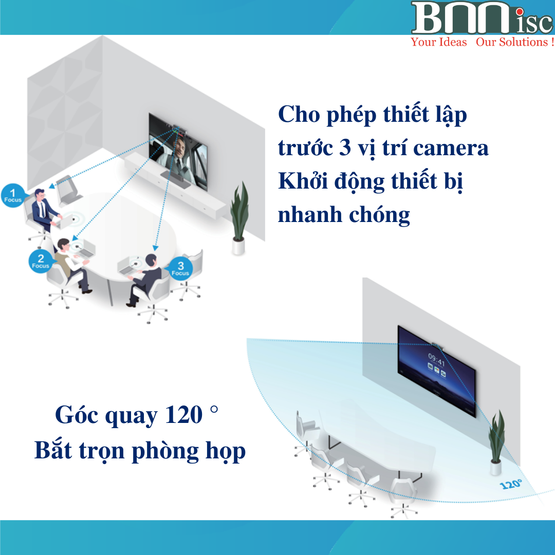 - Góc quay 120° , Lên/Xuống 15° , Tự động cân bằng sáng, giảm nhiễu, Tự động điều chỉnh bắt hình tất cả những People tham gia họp (Auto-Framing), Tự động bắt theo tiếng phát biểu.