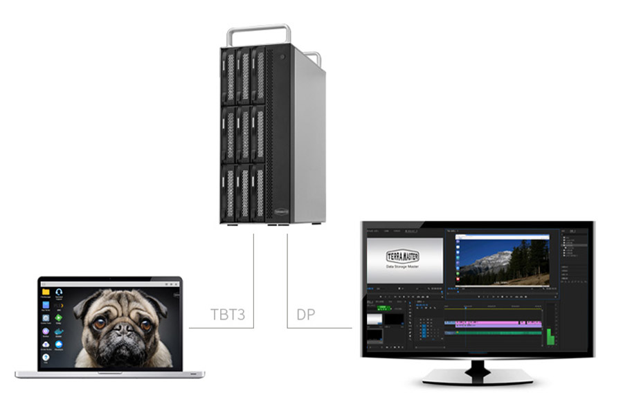 Nếu máy Mac của bạn có cổng Thunderbolt 3 và Thunderbolt 2, bạn có thể tận dụng D8-332 để đạt được tốc độ truyền dữ liệu cao cấp. Với adaptor Thunderbolt 3 (USB-C) sang Thunderbolt 2 của Apple (không phải phụ kiện bán kèm D8-332), TerraMaster D8-332 có thể dễ dàng kết nối với các thiết bị, máy tính hỗ trợ Thunderbolt.