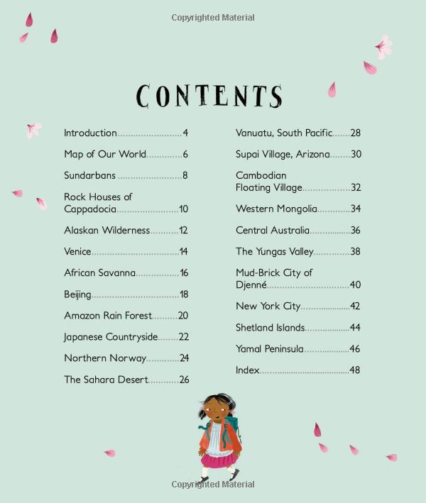The guides are children who tell us about the animals, plants and weather that they encounter; the feasts and festivals they enjoy; and the clothes they wear, the way they learn, the languages they speak, and the sports and games they play. The tour is truly global, as we journey from Australia’s desolate Red Centre to bustling Beijing, from the windswept Outer Hebrides to the rock houses of Cappadocia in Turkey, via the Amazon rainforest, New York City, the Siberian tundra, and a floating village in Cambodia.