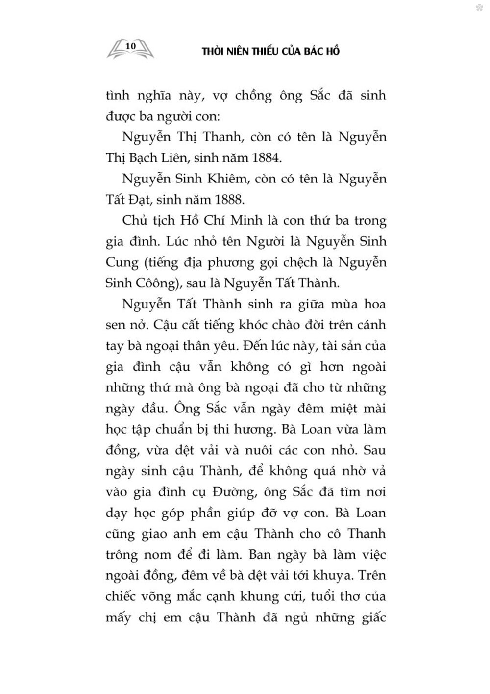 Nhân Kỷ niệm lần thứ 135 ngày sinh của Bác Hồ kính yêu (19/5/1890 – 19/5/2025) - Vị lãnh tụ thiên tài của giai cấp công nhân và dân tộc Việt Nam ta, nhà hoạt động lỗi lạc của phong trào cộng sản và công nhân quốc tế, của phong trào đấu tranh giải phóng dân tộc, Nhà xuất bản Chính trị quốc gia Sự thật xuất bản lần thứ hai cuốn sách với tên gọi Thời niên thiếu của Bác Hồ. Trân trọng giới thiệu cuốn sách cùng bạn đọc