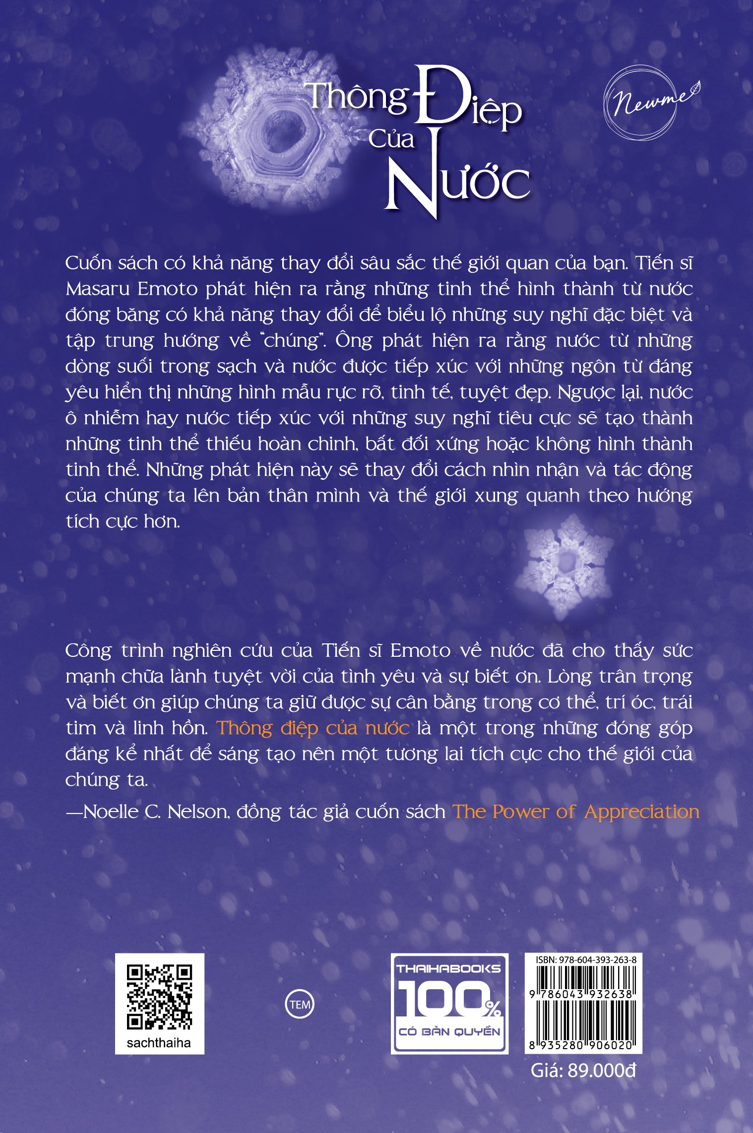 “Thông điệp của nước” có khả năng thay đổi một cách sâu sắc thế giới quan của bạn. Tiến sĩ Masaru Emoto phát hiện rằng những tinh thể hình thành từ nước đóng băng có khả năng thay đổi để biểu lộ những suy nghĩ đặc biệt và tập trung hướng về ‘chúng’. Ông phát hiện ra rằng nước từ những dòng suối trong sạch và nước được tiếp xúc với những ngôn từ đáng yêu hiển thị những hình mẫu rực rỡ, phức tạp và dạng bông tuyết đầy sắc màu. Ngược lại, nước ô nhiễm, hay nước tiếp xúc với những suy nghĩ tiêu cực, hình thành những hình mẫu thiếu hoàn chỉnh, bất đối xứng có màu sắc mờ tối. Ý nghĩa của nghiên cứu này chính là hình thành nên lối nhận thức mới về cách chúng ta có thể tác động tích cực đến trái đất và chính sức khỏe cá nhân mỗi chúng ta.