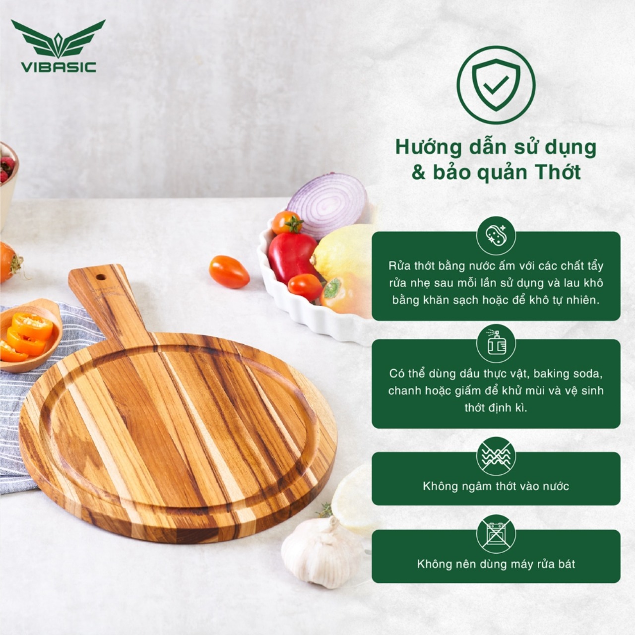 ✨Thớt Gỗ Teak kháng khuẩn Vibasic hình tròn có tay cầm kích thước 25x1.8cm - Hàng chính hãng Bộ Quốc Phòng