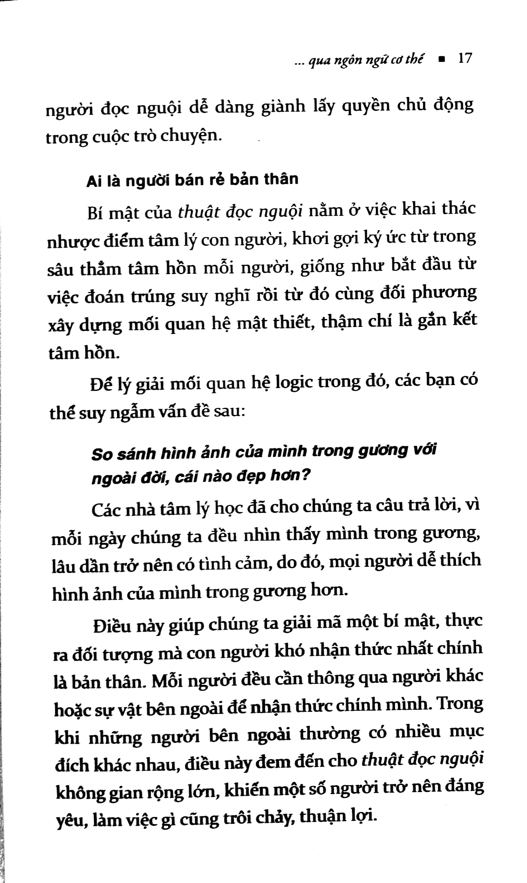 Thuật Đọc Nguội Làm thế nào để có thể áp dụng hiệu quả tâm lý học vào quan hệ giao tiếp? Nhà giáo Hiroyuki Ishii (Nhật Bản) đã phát triển một kỹ năng giao tiếp mang tính thực tế cao – thuật đọc nguội. Trong tình huống không có sự chuẩn bị trước, kỹ năng này dùng để nắm bắt tâm lý của đối phương và dự báo sự việc sẽ diễn ra trong tương lai, nhờ đó có thể nhanh chóng được đối phương tin tưởng. Trên các trang mạng và diễn đạt, người ta thảo luận sôi nổi về kỹ năng này. Kết quả thử nghiệm của một nhóm nghiên cứu phát triển kỹ năng thuật đọc nguội đã khiến nhiều người cảm thấy rất thú vị và hào hứng. Mặc dù vậy, mức độ phổ cập và phạm vi ứng dụng kỹ năng này trong xã hội còn rất hạn hẹp và khá xa lạ với số đông những người yêu thích tâm lý học, những người gặp khó khăn về giao tiếp xã hội, chưa nói đến chuyện ứng dụng thành thục. Trong các kỹ năng giao tiếp của con người, thuật đọc nguội chỉ là một cách gọi, còn bản chất của nó vẫn là ứng dụng những kiến thức tâm lý học như: đọc hiểu nội tâm, cảm ứng, thôi miên… Với mục đích học để ứng dụng, dựa trên những kết quả nghiên cứu ứng dụng tâm lý học trong một thời gian dài, tác giả trình bày và giải thích về thuật đọc nguội một cách hệ thống. Sau khi tổng hợp tối đa các kiến thức chuyên ngành như: tâm lý học, ngôn ngữ học, marketing… tác giả đã chỉnh lý, bổ sung và kết cấu thành hệ thống về kỹ năng này từ những ứng dụng của nó trong cuộc sống hàng ngày như: làm sao để nhanh chóng có được sự tin tưởng của đối phương, hay làm thế nào để khởi đầu giao tiếp một cách thuận lợi, tìm hiểu và nắm bắt tâm lý của người hướng nội hay hướng ngoại… Trong chương cuối cùng của cuốn sách, tác giả tuyển chọn ra chin loại hình ngôn ngữ đọc nguội quan trọng nhất trong giao tiếp xã hội. Khi đã nắm vững kỹ năng, vận dụng thành thục thuật đọc nguội để hiểu thấu và điều khiển suy nghĩ của đối phương, bạn sẽ chiếm được cảm tình của rất nhiều người, các mối quan hệ xã hội của bạn cũng từ đó sẽ ngày càng được mở rộng. Trong cuộc sống hằng ngày, việc xử lý các vấn đề như: quan hệ với khách hàng, ứng xử với sếp và nhân viên, làm thế nào để xây dựng mối quan hệ thân thiết với người khác giới, làm thế nào để phát triển nhiều hơn nữa các mối quan hệ xã hội… khiến chúng ta đau đầu. Mục đích duy nhất của cuốn sách này là giúp bạn giải quyết những vấn đề kể trên: hướng dẫn bạn cách chung sống hòa thuận với mọi người trong công việc, đời sống. Qua việc đọc cuốn sách này, bạn sẽ dễ dàng nắm vững và vận dụng kỹ năng giao tiếp xã hội, giúp bạn phát huy sức hấp dẫn, được chào đón mọi lúc mọi nơi, dễ dàng chiếm được cảm tình và niềm tin của mọi người .