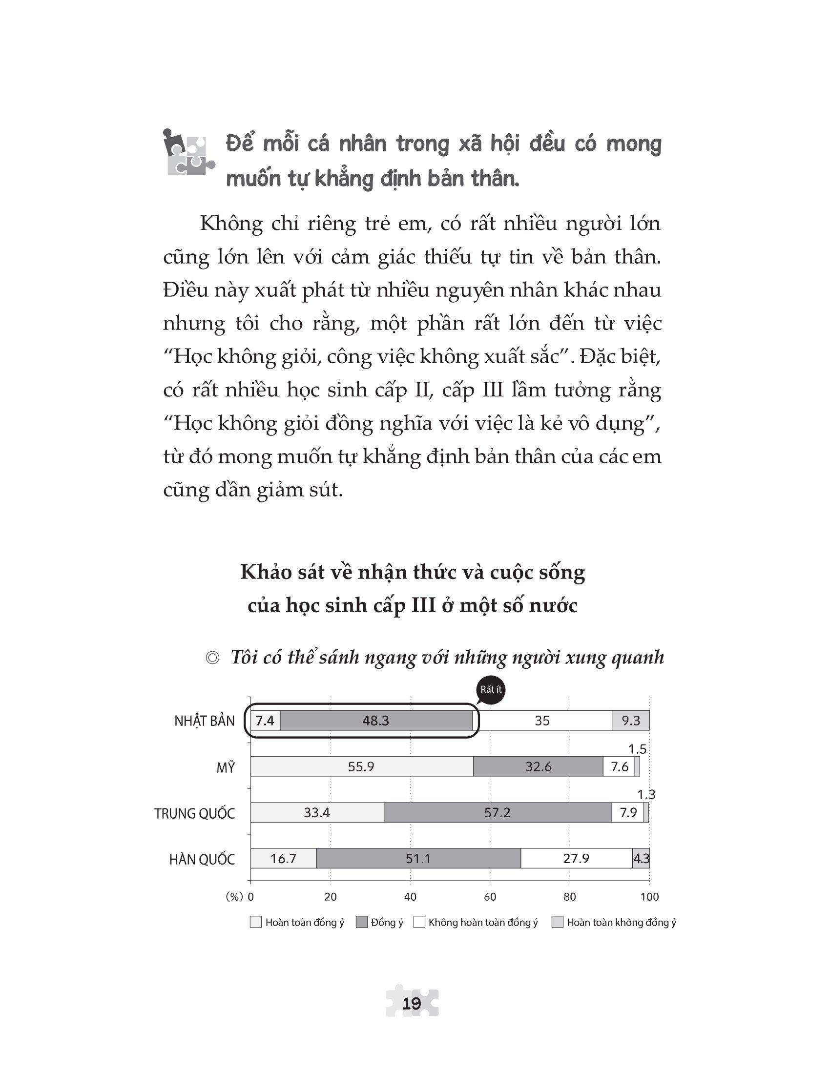 - Làm thế nào để học tập, làm việc đạt được kết quả cao hơn? Nó có thể do bẩm sinh nhưng cũng có thể do sự khác biệt về phương pháp học tập hay làm việc. Một khi tìm được nguyên nhân, bạn sẽ nhận ra phương hướng cho sự nỗ lực của m.ình. Vì vậy, khi kết quả đạt được không như ý, đó không phải là do bạn nỗ lực chưa đủ, mà là do phương hướng bạn lựa chọn đã sai lầm ngay từ đầu. Điều quan trọng chính là tìm ra cách cải thiện não bộ của chính bạn, phương pháp đó được gọi là thuật “hack não”. Một khi “thông số kỹ thuật” của hệ điều hành não bộ được cải thiện, hành động so sánh này sẽ dần được giảm thiểu, đồng thời, mong muốn tự khẳng định bản thân cũng nâng cao. Khi mong muốn tự khẳng định bản thân được nâng cao, bạn sẽ hoà nhã, thân thiện hơn với những người xung quanh bởi khi đó bạn hài lòng với chính m.ình. Con người có xu hướng tìm kiếm những điểm tương đồng với tâm hồn, vì thế khi bạn hài lòng với chính m.ình, bạn sẽ nhìn thấy những điểm tốt, những điều tuyệt vời ở đối phương. Ngược lại, khi bạn bất mãn với chính bản thân m.ình, bạn sẽ chỉ nhìn thấy những khiếm khuyết, những thiếu sót của họ. Do đó, nâng cao mong muốn tự khẳng định bản thân cũng là một yếu tố quan trọng giúp bạn cảm thấy hài lòng, thoả mãn hơn với chính m.ình. Vậy, hãy tìm kiếm phương pháp giúp đánh thức tiềm năng não bộ, tăng cường khả năng tư duy, tìm ra sức hấp dẫn của riêng bạn, tìm kiếm những phần tốt đẹp hơn so với bạn trong quá khứ và phát triển chúng. Tác giả: Katsunori Ishida là Giám đốc đại diện Phòng Nghiên cứu thiết kế chương trình giáo dục tại Nhật Bản. Ông đã tổ chức rất nhiều chương trình như Mama Café, các buổi diễn thuyết, viết sách… với mong muốn “giảm thiểu tình trạng trẻ em chán ghét việc học”.