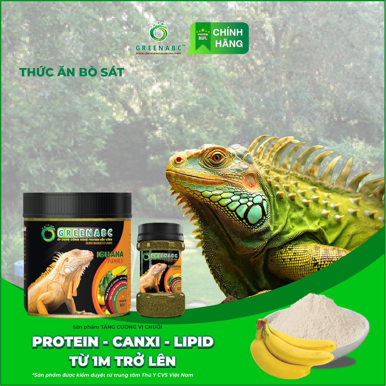 Mua tại TiktokGREENABC - THỨC ĂN IGUANA TRƯỞNG THÀNH VỊ CHUÔI- Rồng Nam Mỹ trưởng thành từ 1m trở lên GREENABC là thức ăn cao cấp dành cho Iguana Trưởng Thành - Rồng Nam Mỹ Trưởng Thành. Đặc biệt sản phẩm GREENABC được sản xuất theo phương pháp Áp dụng công nghệ PROTEIN bền vững từ bột đạm G.Meal rất giàu PROTEIN – CANXI – LIPID có trong BSFL, đã được Mỹ (AAFCO) và EU chấp nhận đưa vào công thức cho ngành sản xuất thức ăn dành cho vật nuôi. Sản phẩm GREENABC cung cấp các giá trị dinh dưỡng bền vững cho Iguana với sự kết hợp 90% thành phần có nguồn gốc thực vật và 10% thành phần có nguồn gốc động vật từ côn trùng, giúp cho Iguana: