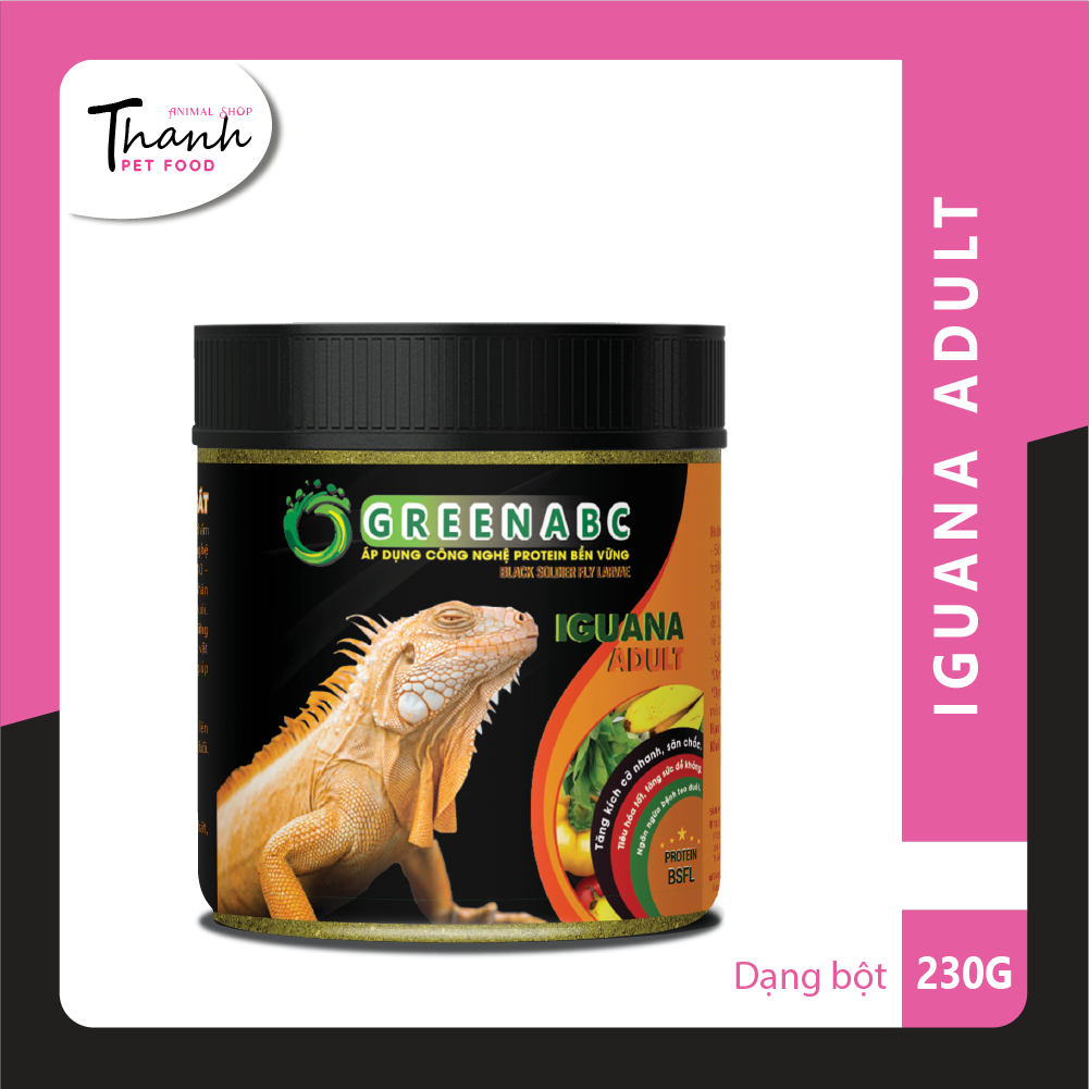 GREENABC là thức ăn cao cấp dành cho Iguana Trưởng Thành - Rồng Nam Mỹ Trưởng Thành. Đặc biệt sản phẩm GREENABC được sản xuất theo phương pháp Áp dụng công nghệ PROTEIN bền vững từ bột đạm G.Meal rất giàu PROTEIN – CANXI – LIPID có trong BSFL, đã được Mỹ (AAFCO) và EU chấp nhận đưa vào công thức cho ngành sản xuất thức ăn dành cho vật nuôi.